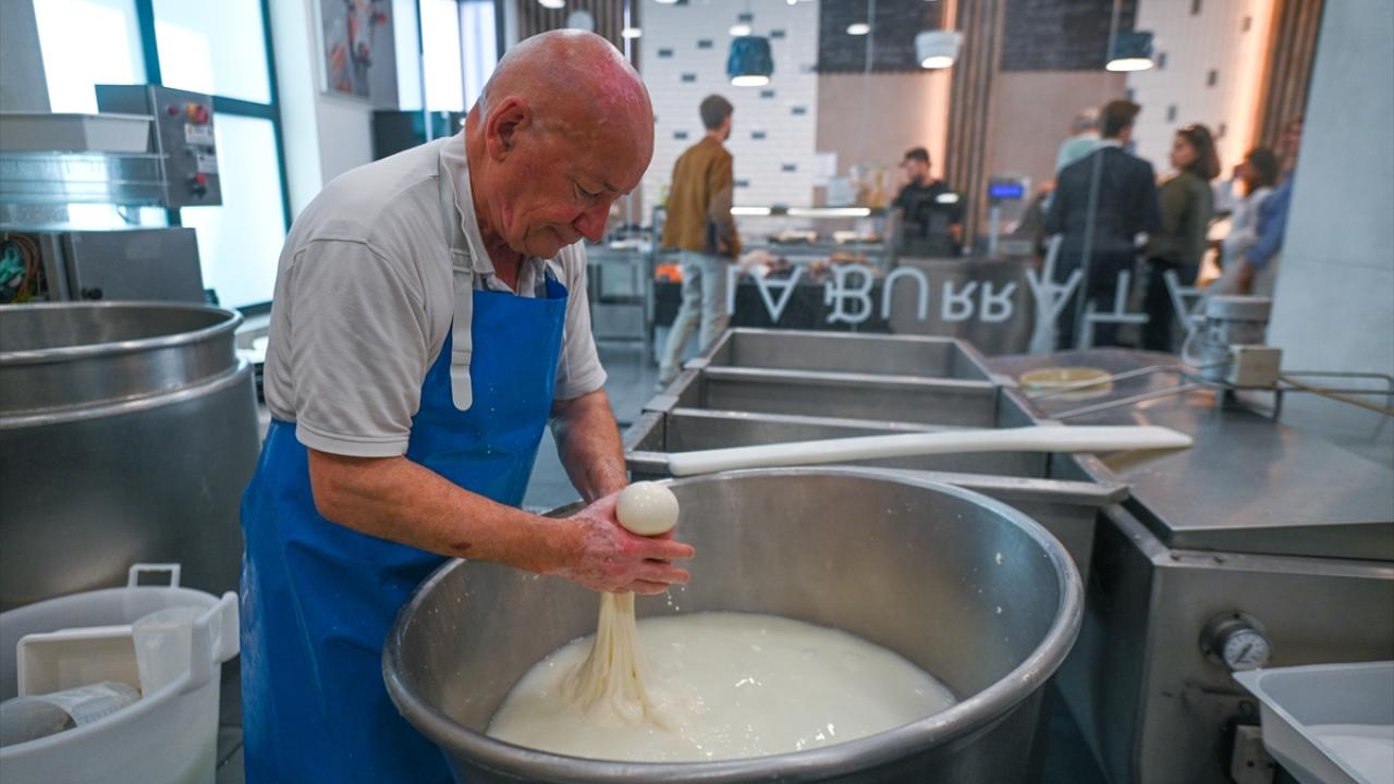 “La Burrata” adlı restorana gelen müşterilerin meraklı bakışları arasında peynirini yapan Mimmo, yaptığı lezzetli peynirlerle adeta damakları çatlatıyor.