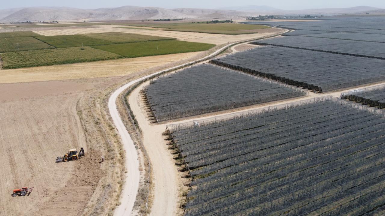 Bahar aylarında don olaylarına karşı onlarca pervanenin bulunduğu bahçenin üzerine serilen fileyle elma ağaçları doludan ve aşırı sıcaklardan korunuyor.