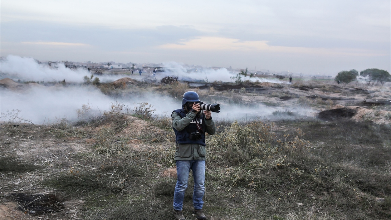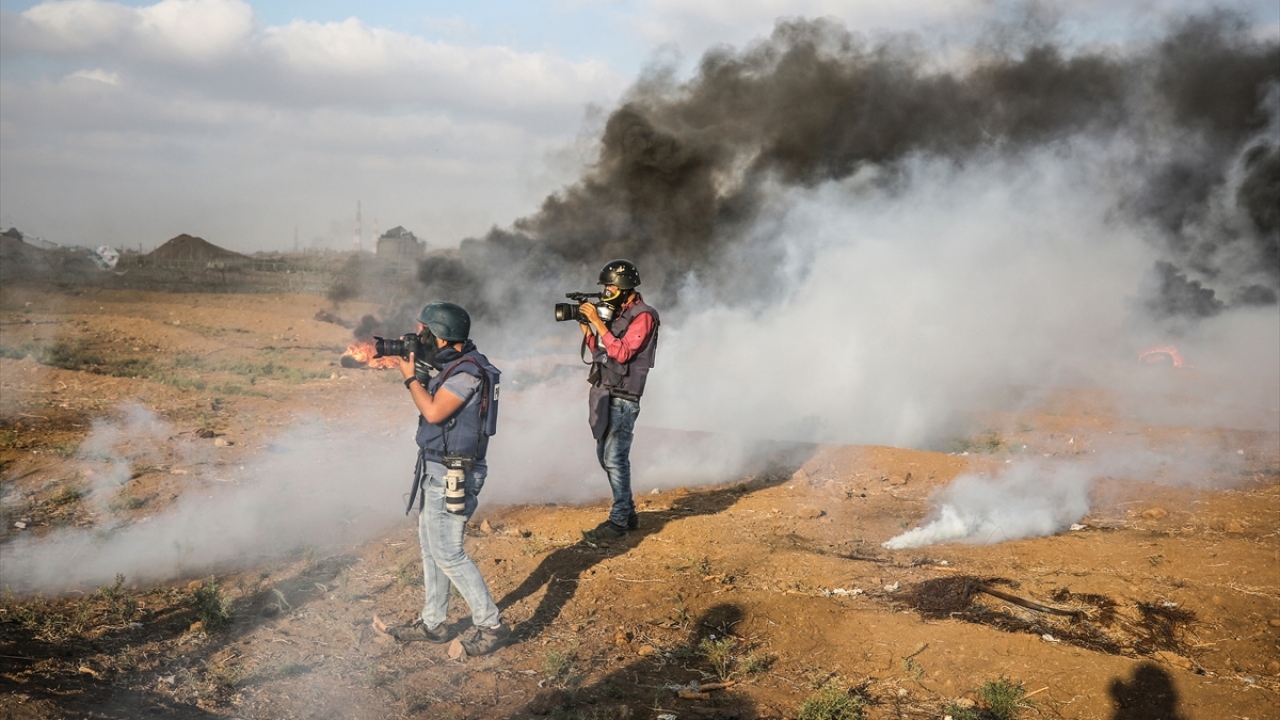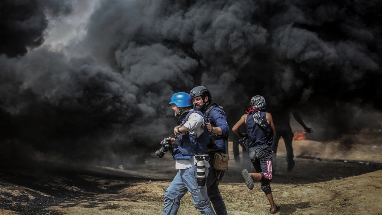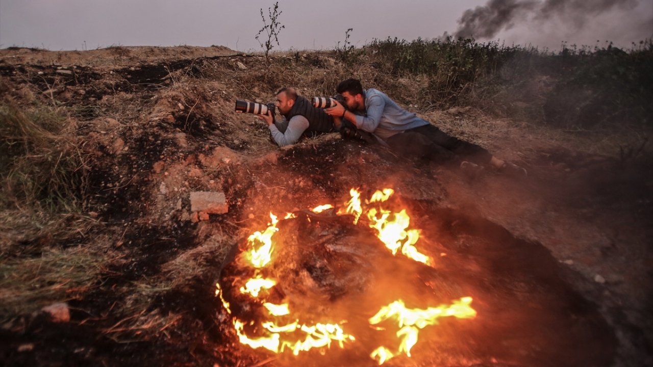 İsrail ablukası altındaki Gazze Şeridi sınırında düzenlenen barışçıl "Büyük Dönüş Yürüyüşü" gösterilerini görüntülemeye çalışan basın mensupları zorlu şartlarda görevlerini yapıyor. (Arşiv)