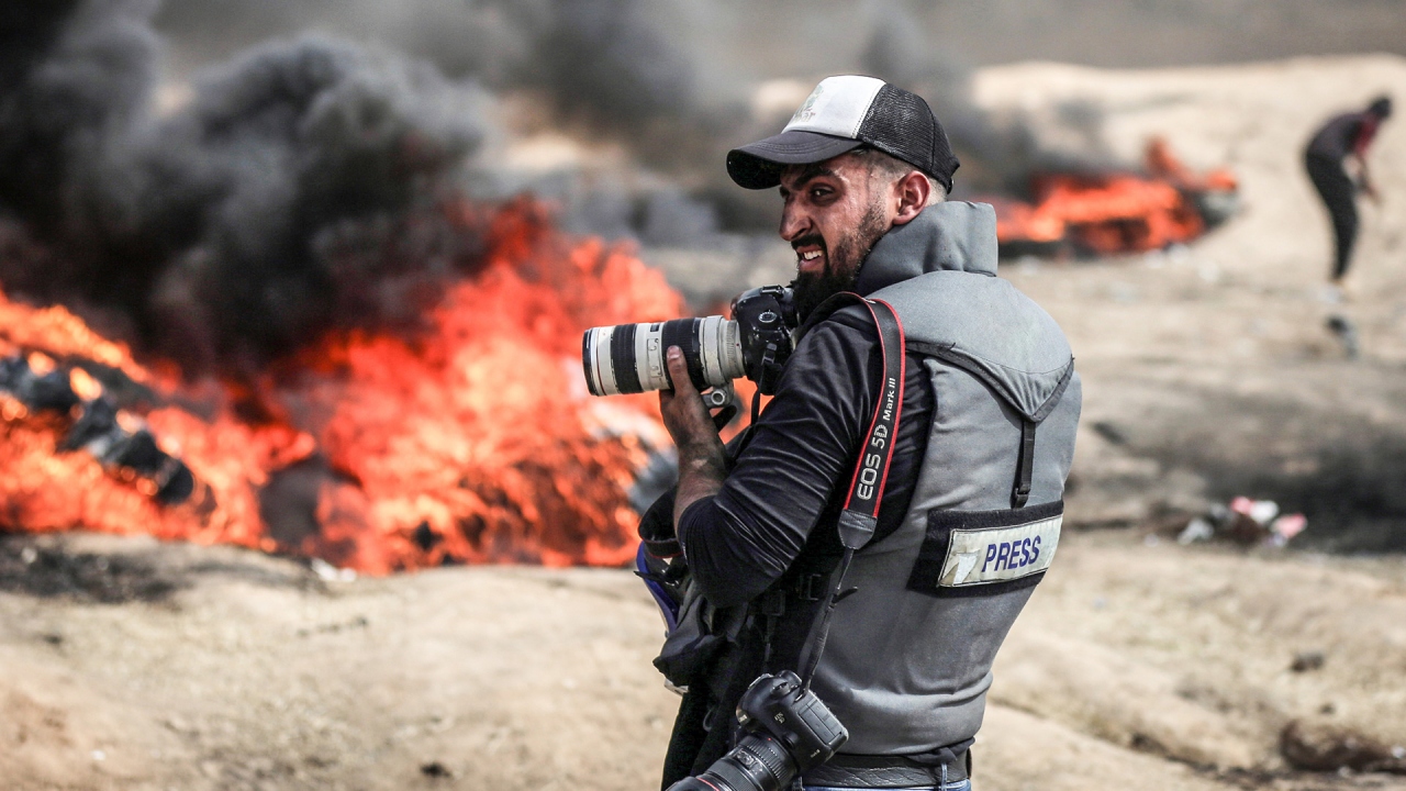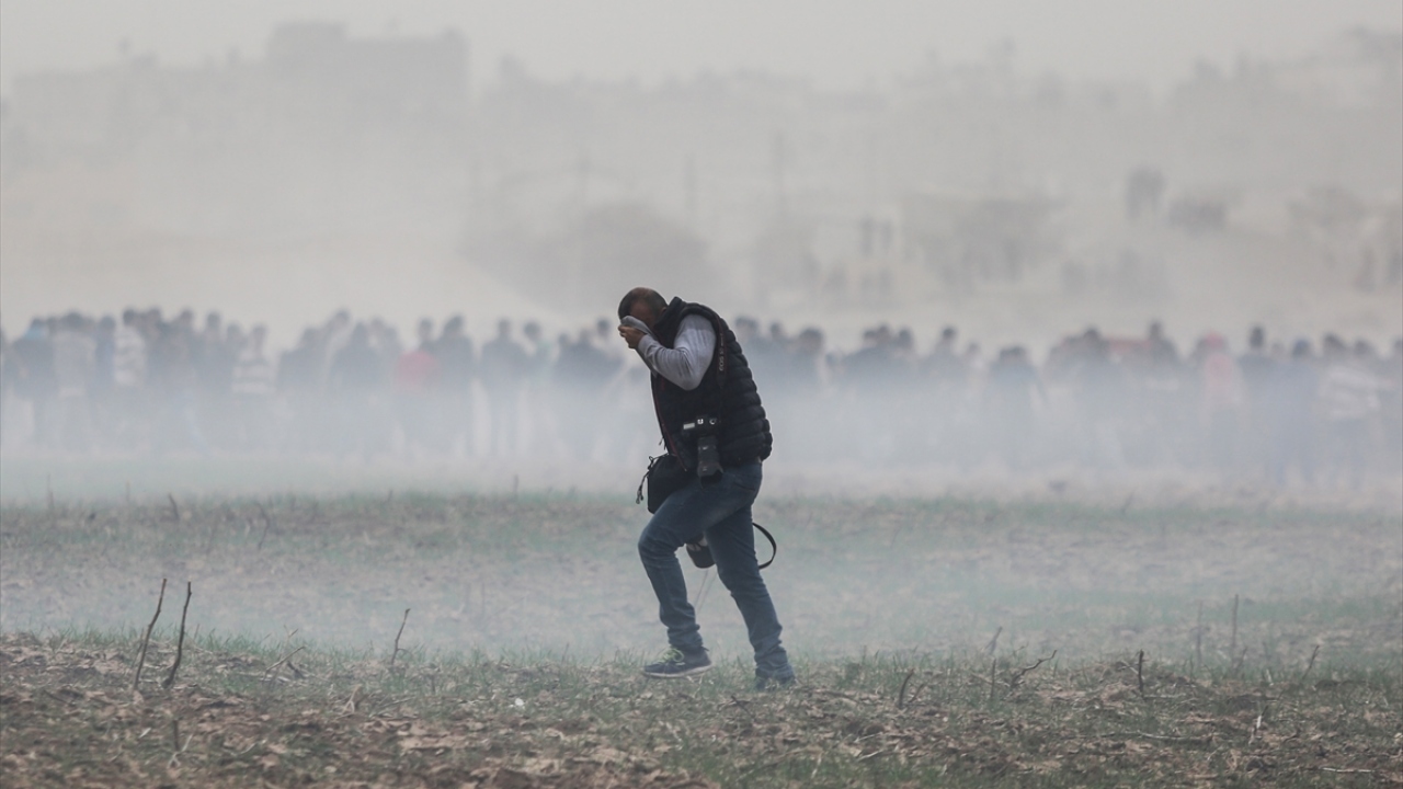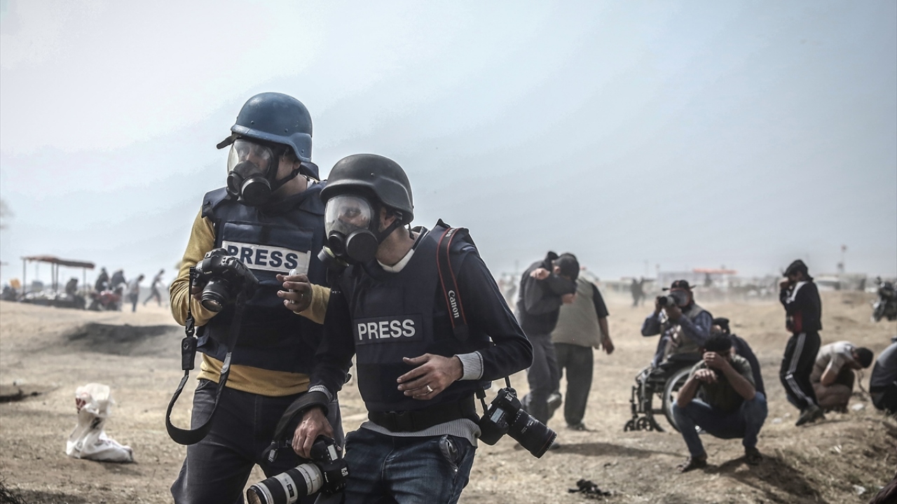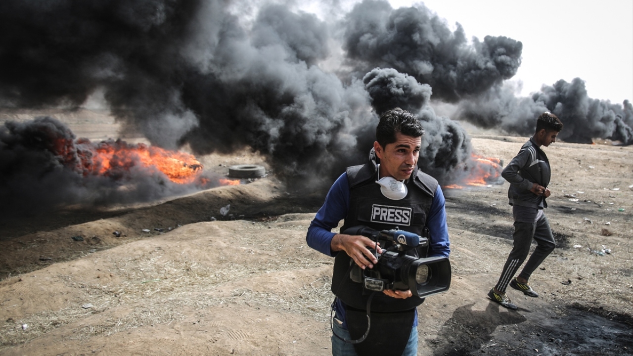 İsrail ablukası altındaki Gazze Şeridi sınırında düzenlenen barışçıl "Büyük Dönüş Yürüyüşü" gösterilerini görüntülemeye çalışan basın mensupları zorlu şartlarda görevlerini yapıyor. (Arşiv)