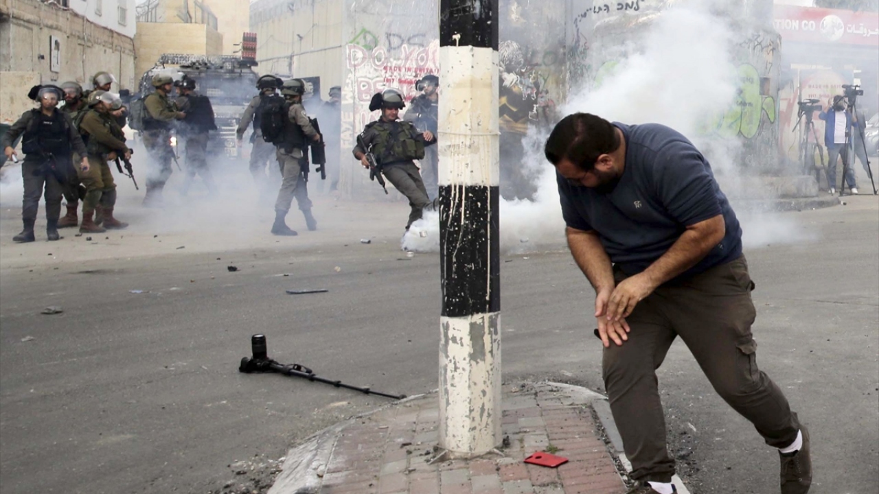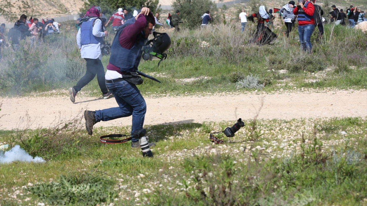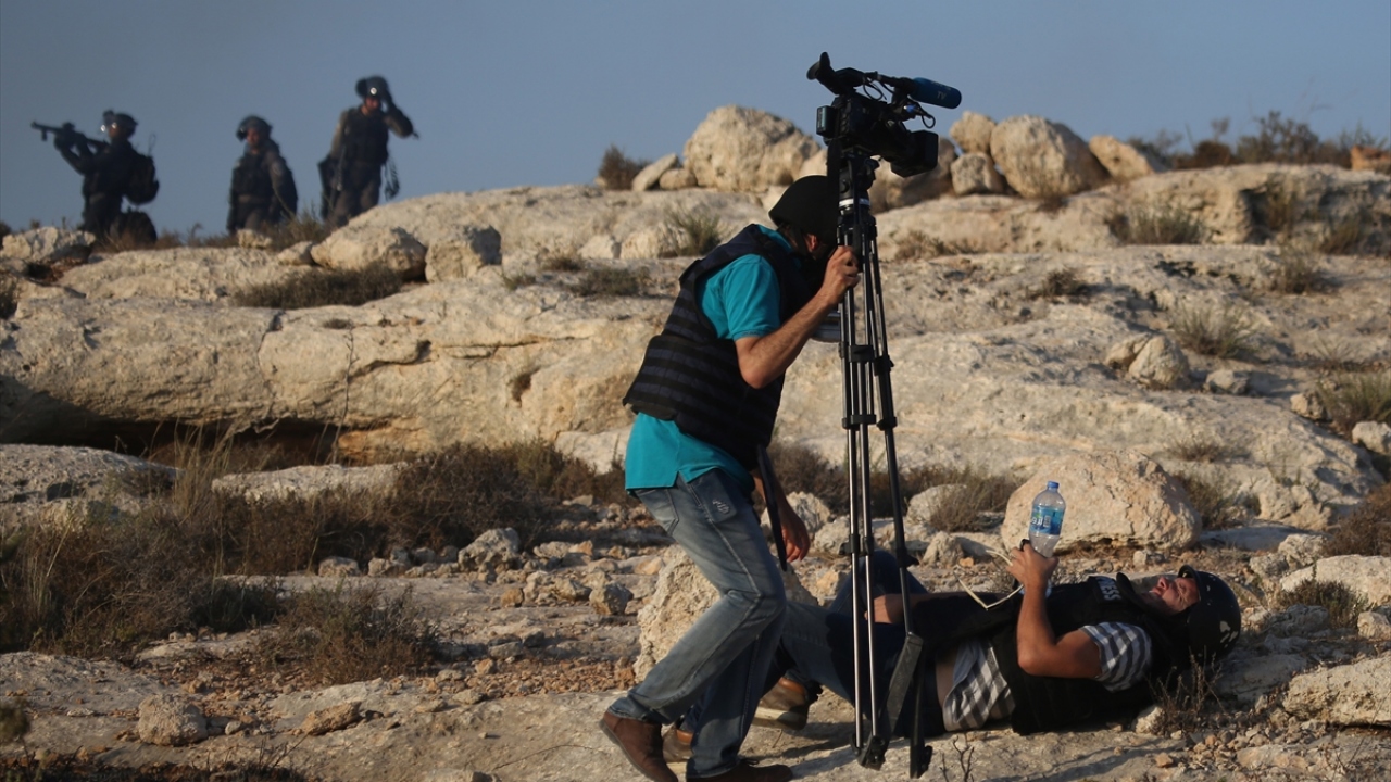 Filistin Halk Direniş Komitelerinin, Ayrım Duvarı ve Yahudi yerleşim birimlerine karşı gösterileri sırasında İsrail askerlerinin göstericilere yönelik müdahalesini görüntülemeye çalışan Anadolu Ajansı (AA) foto muhabiri İssam Rimavi de askerlerin attığı göz yaşartıcı gaz kapsülünün eline isabet etmesi sonucu yaralandı. (Arşiv)