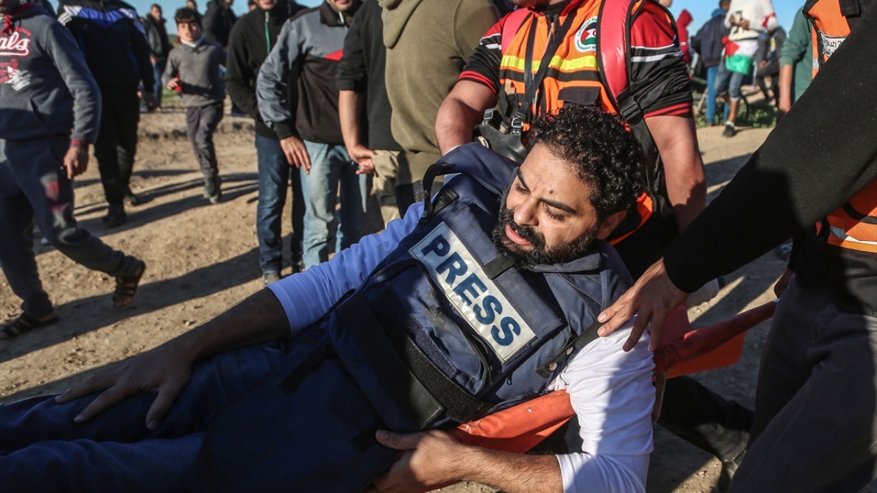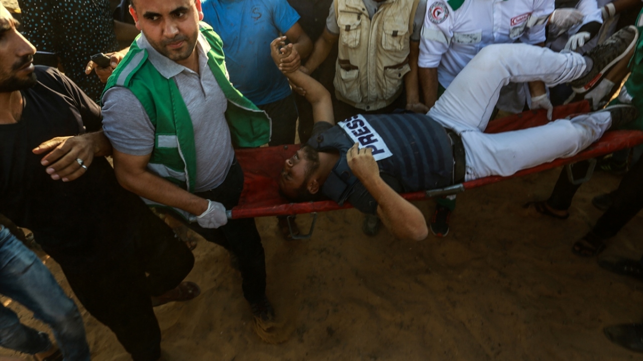 İsrail güvenlik güçlerinin Büyük Dönüş Yürüyüşü gösterileri sırasındaki müdahalesi sonucu yaralanan Filistinli bir gazeteci, sağlık görevlileri tarafından bölgeden uzaklaştırıldı. (Arşiv)