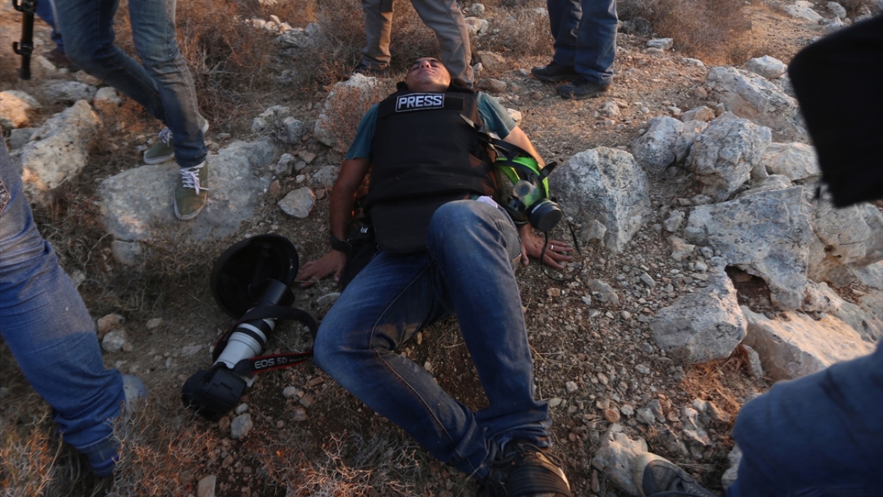 Batı Şeria`nın Ramallah kentindeki Filistinliler, Yahudi yerleşimcilerin bir süredir yeni yerleşim birimi inşa etmek için kasabada Filistinlilere ait araziler üzerinde yol açma çalışmalarını protesto ettiği sırada, olayları takip eden AA foto muhabiri İsam Rimavi, Fransız haber ajansı (AFP) muhabirleri Abbas Mumini ve İngiliz vatandaşı Joe Dyke (yerde) plastik mermiyle açılan ateş sonucu ayaklarından yaralandı. (Arşiv)