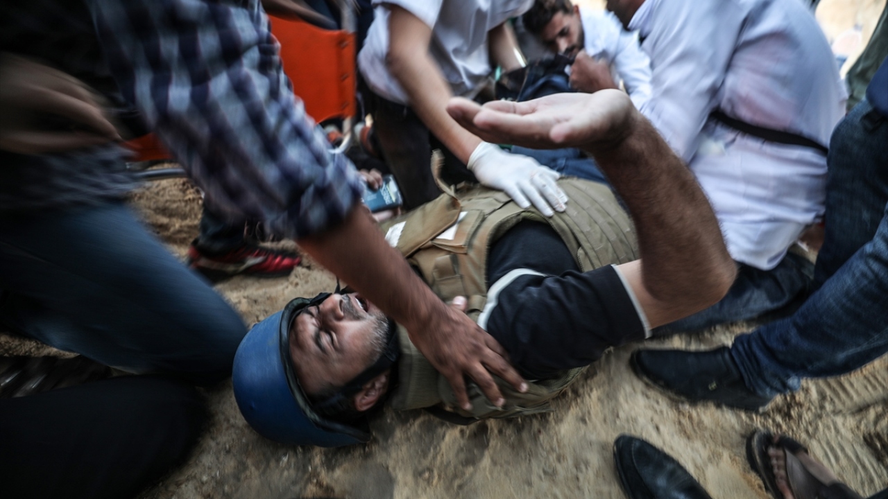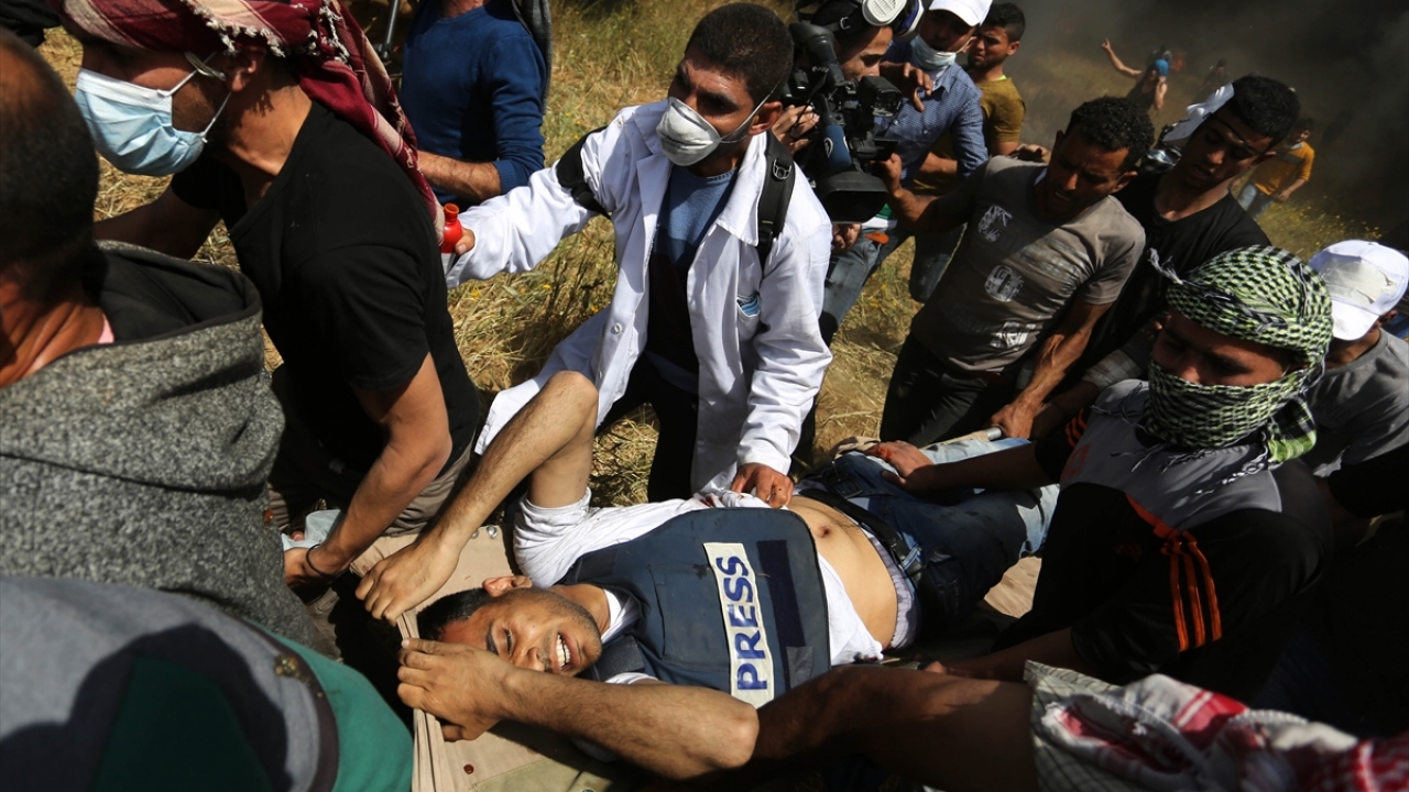 İsrail ablukası altındaki Gazze Şeridi’nin sınır hattında her hafta cuma günü düzenlenen “Büyük Dönüş Yürüyüşü” gösterilerini takip eden Anadolu Ajansı’nın (AA) foto muhabiri Mustafa Hassona, İsrail askerlerinin attığı gaz bombasının isabet etmesi sonucu ayağından yaralandı. Hassona, ambulansa taşınarak tedavi altına alındı. (Arşiv)