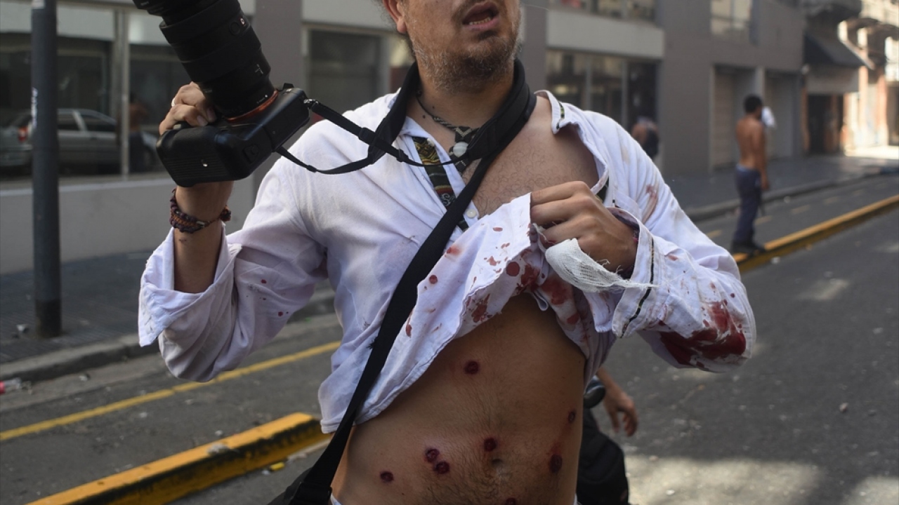 Bir muhabir, Arjantin`in başkenti Buenos Aires`te düzenlenen emeklilik reformu protestolarını takip ederken, Arjantin güvenlik güçlerinin göstericilere müdahale sırasında plastik mermiyle yaraladı. (Arşiv)