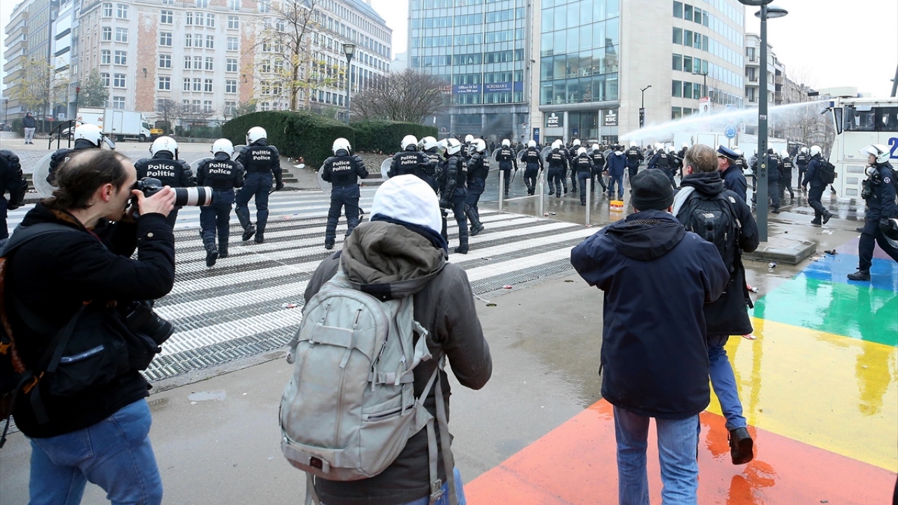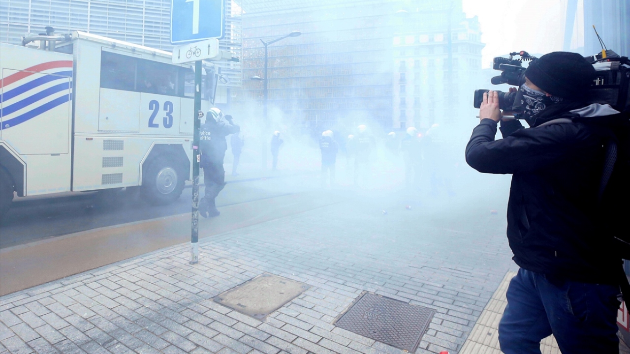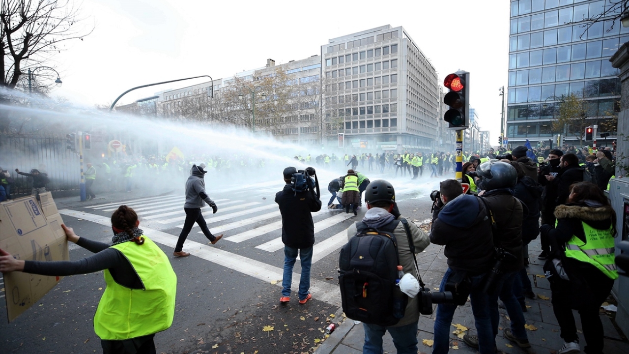 Basın mensupları, "sarı yeleklilerin", Belçika`nın başkenti Brüksel`de akaryakıt zamları ve kötüleşen ekonomik koşulları protesto ettiği gösterileri de zorlu şartlar altında yakından takip etti. (Arşiv)