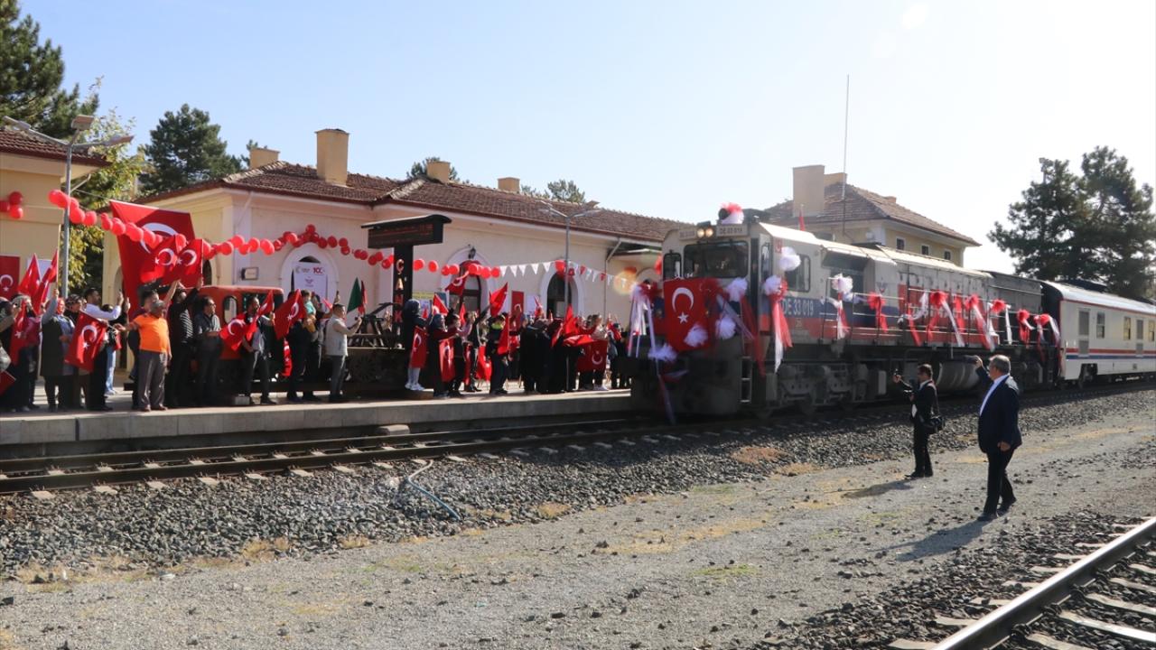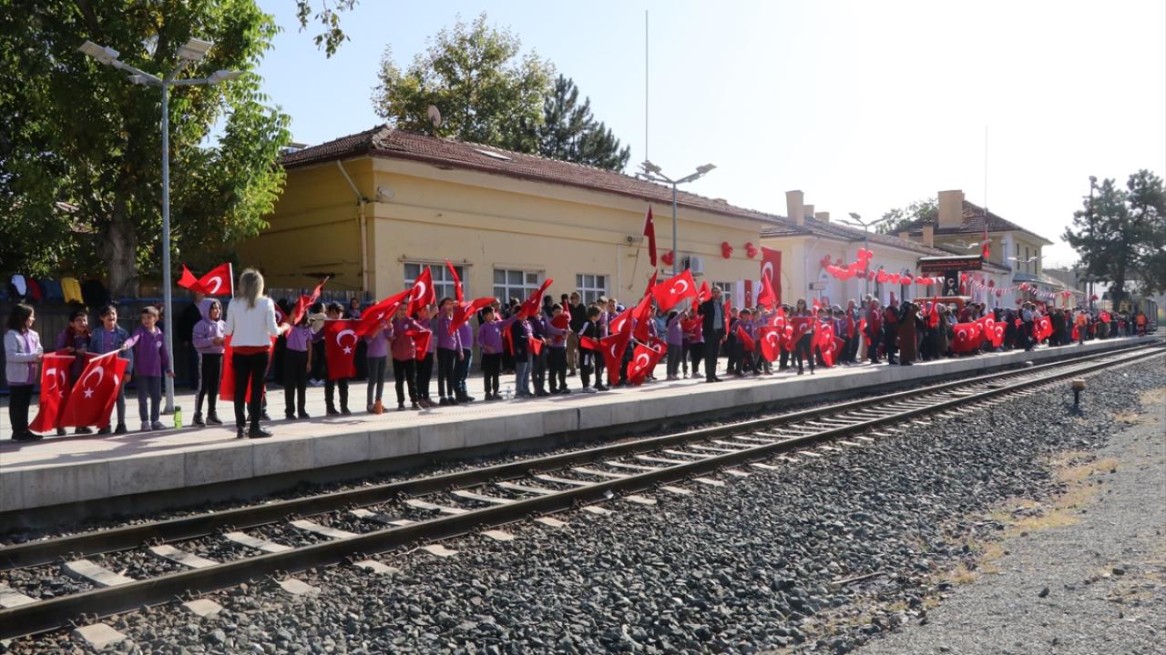 Çankırı Garı`nda bekleyen öğrenciler ve vatandaşlar, Cumhuriyet Treni`ni ellerinde Türk bayraklarıyla karşıladı.