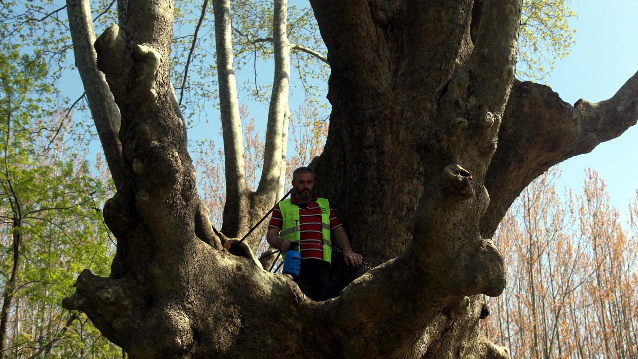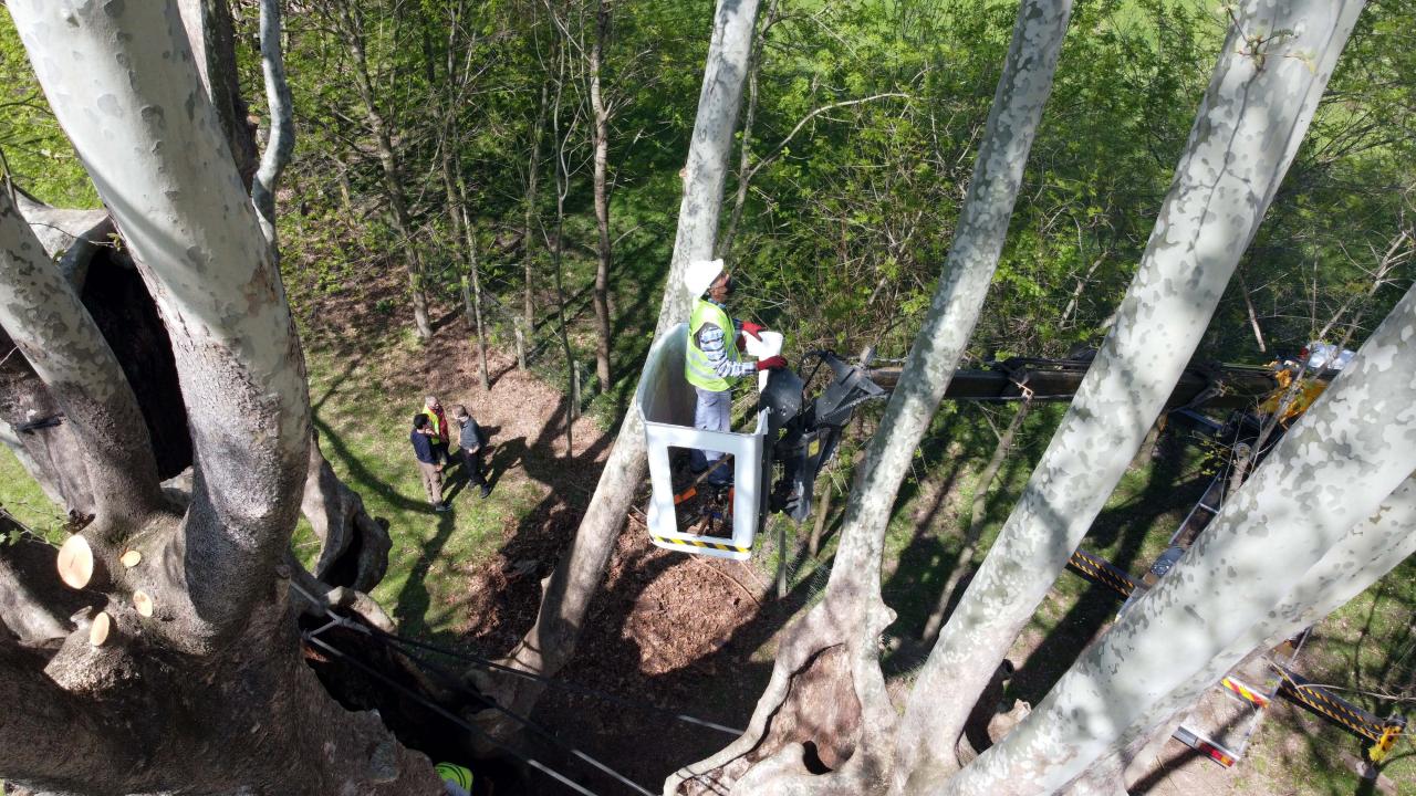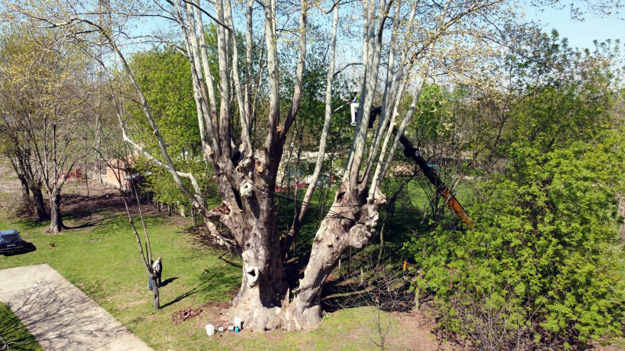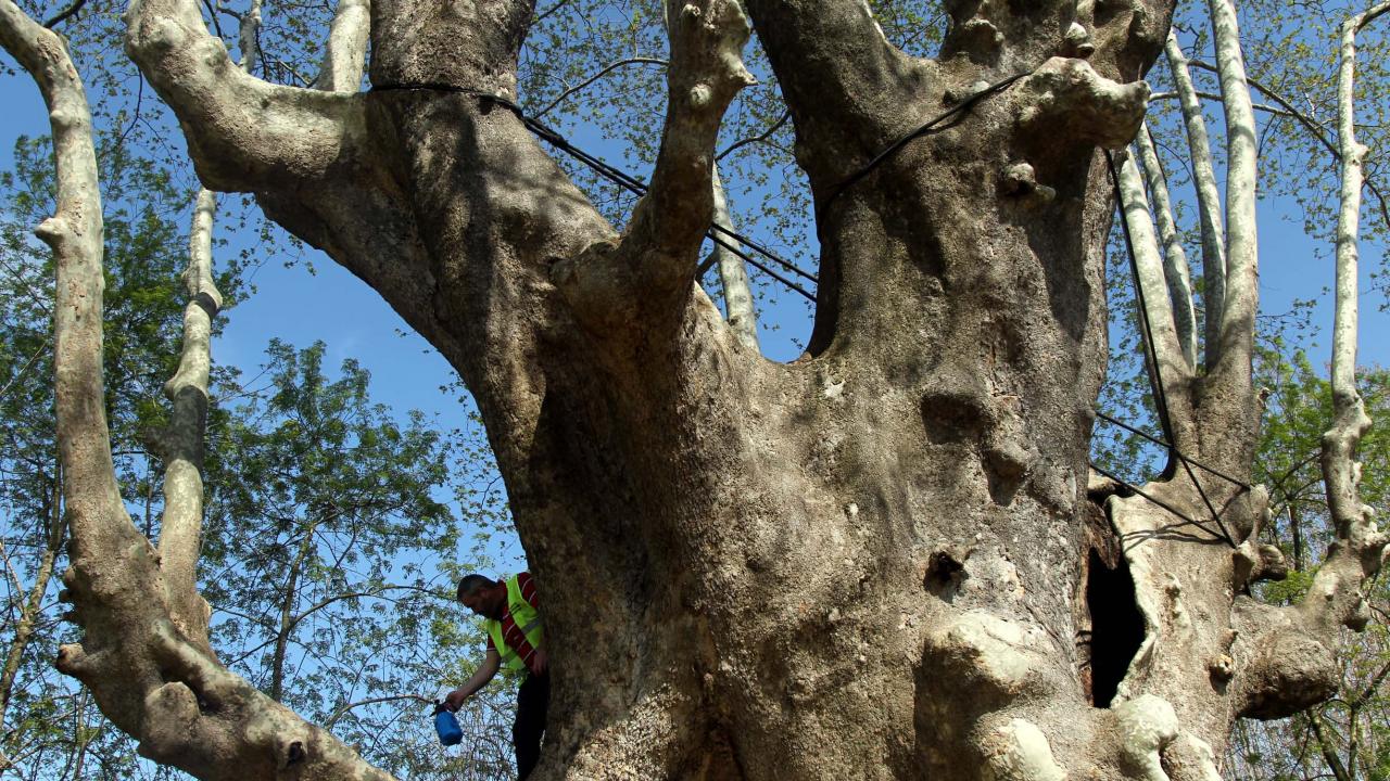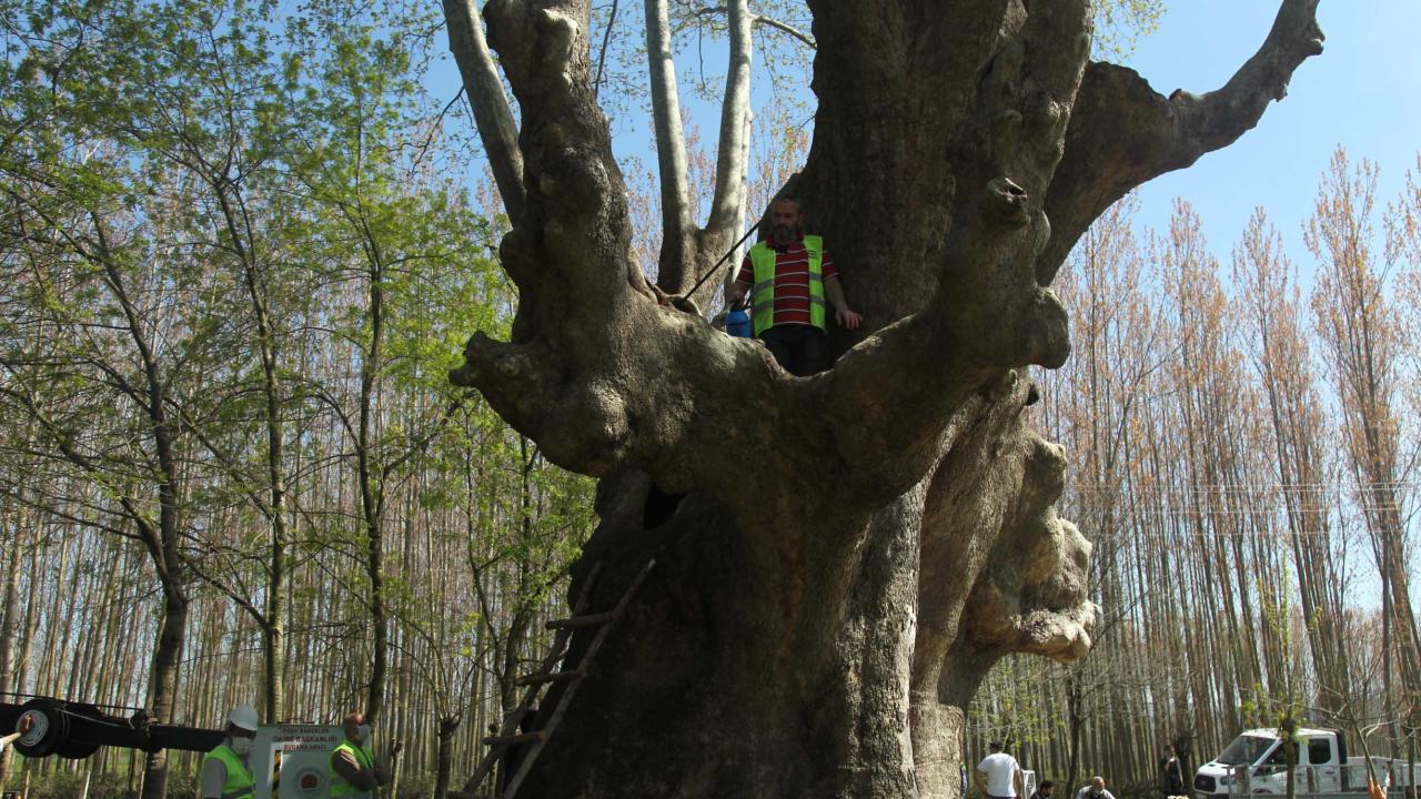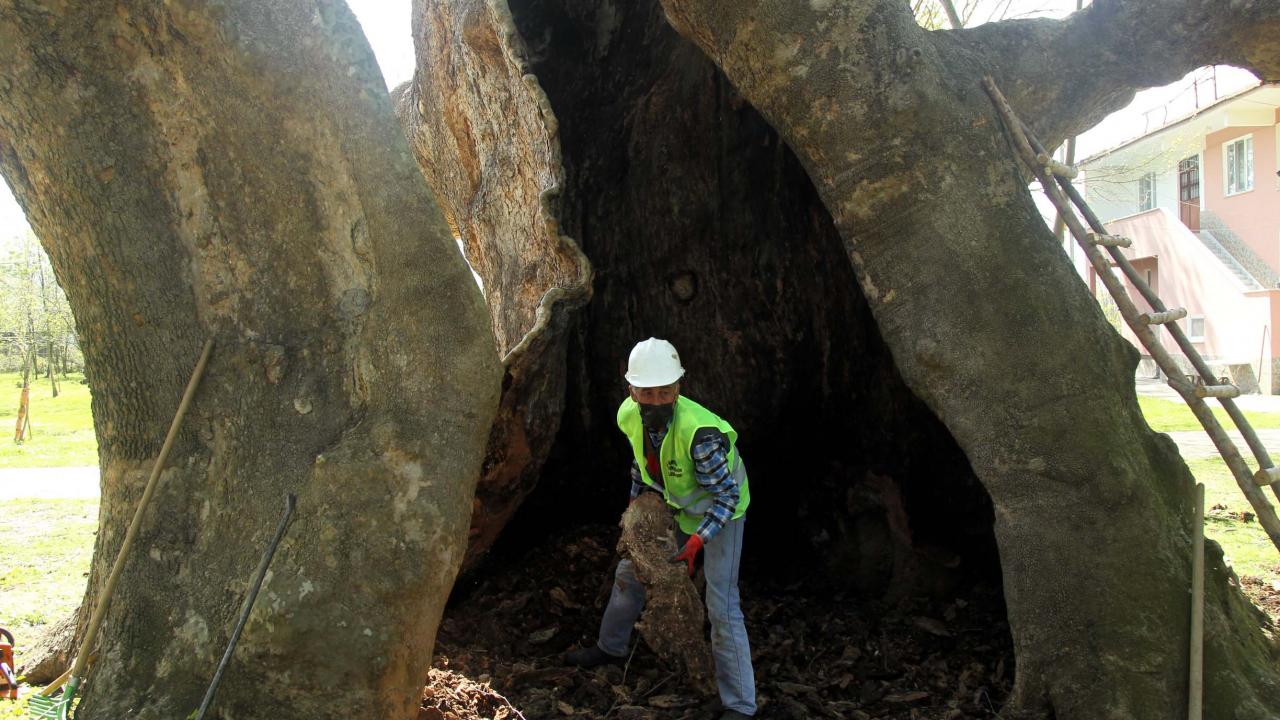 Anıt ağacın gelecek nesillere aktarılması için yapılan bakımda çınarın kovukları temizlenirken ilaçlama ve gübreleme yapılıyor.