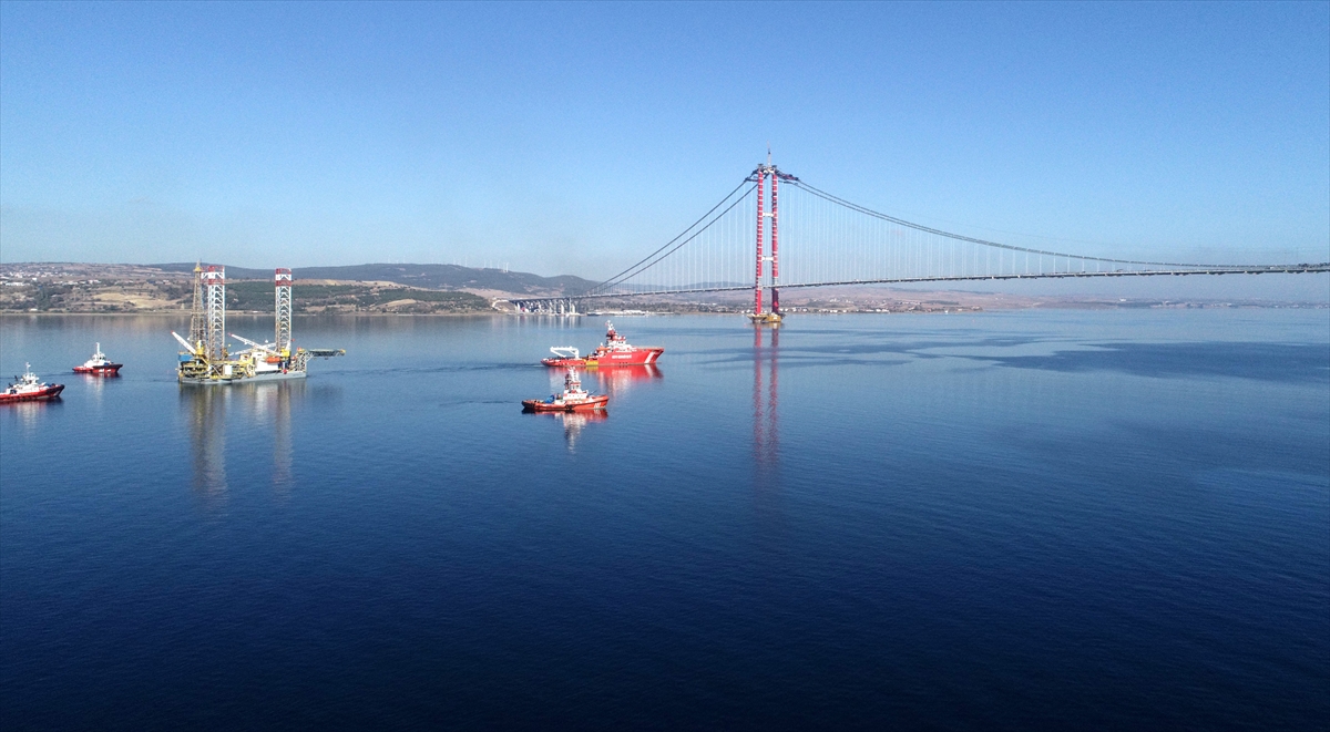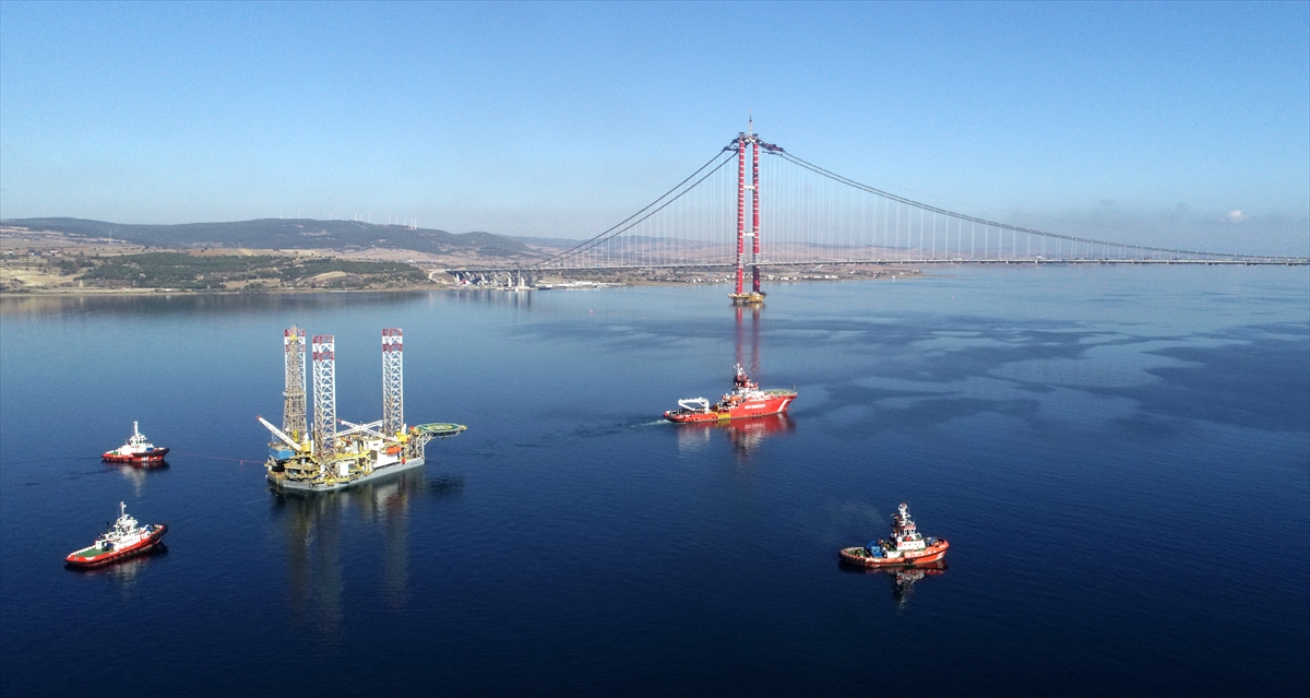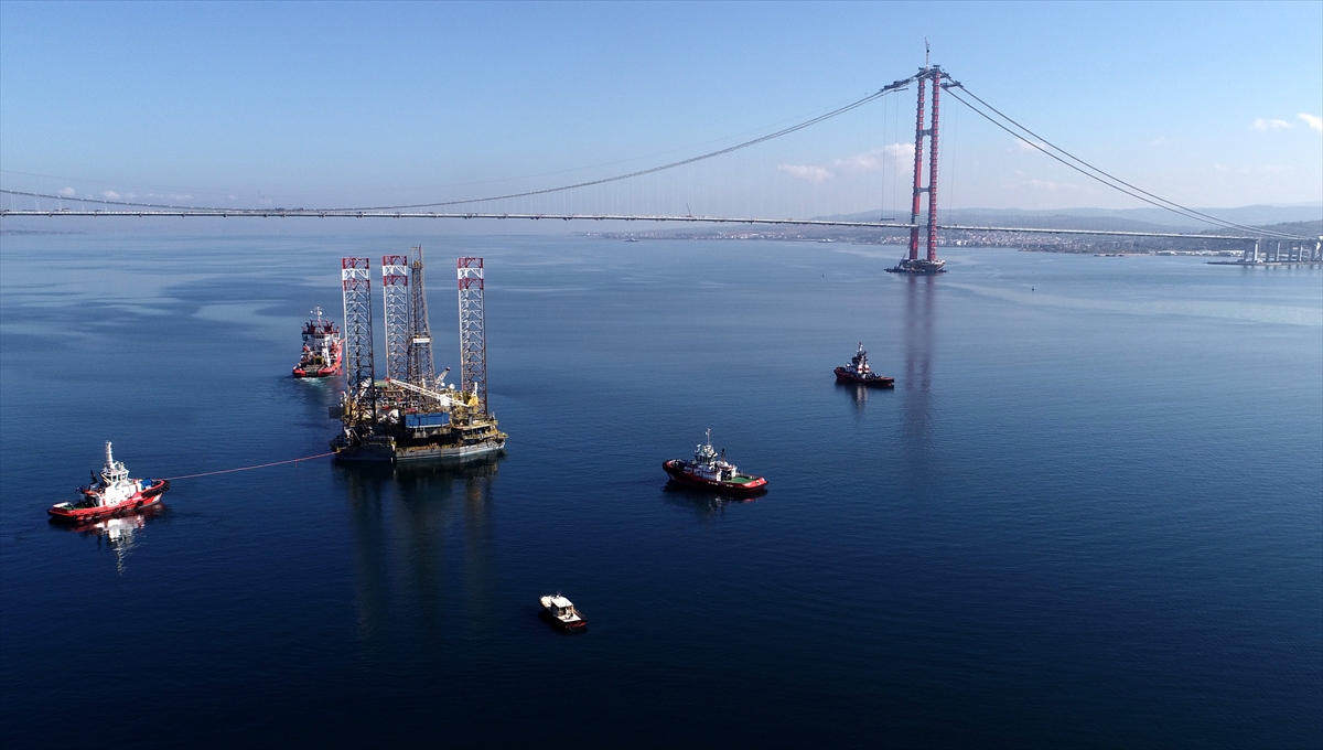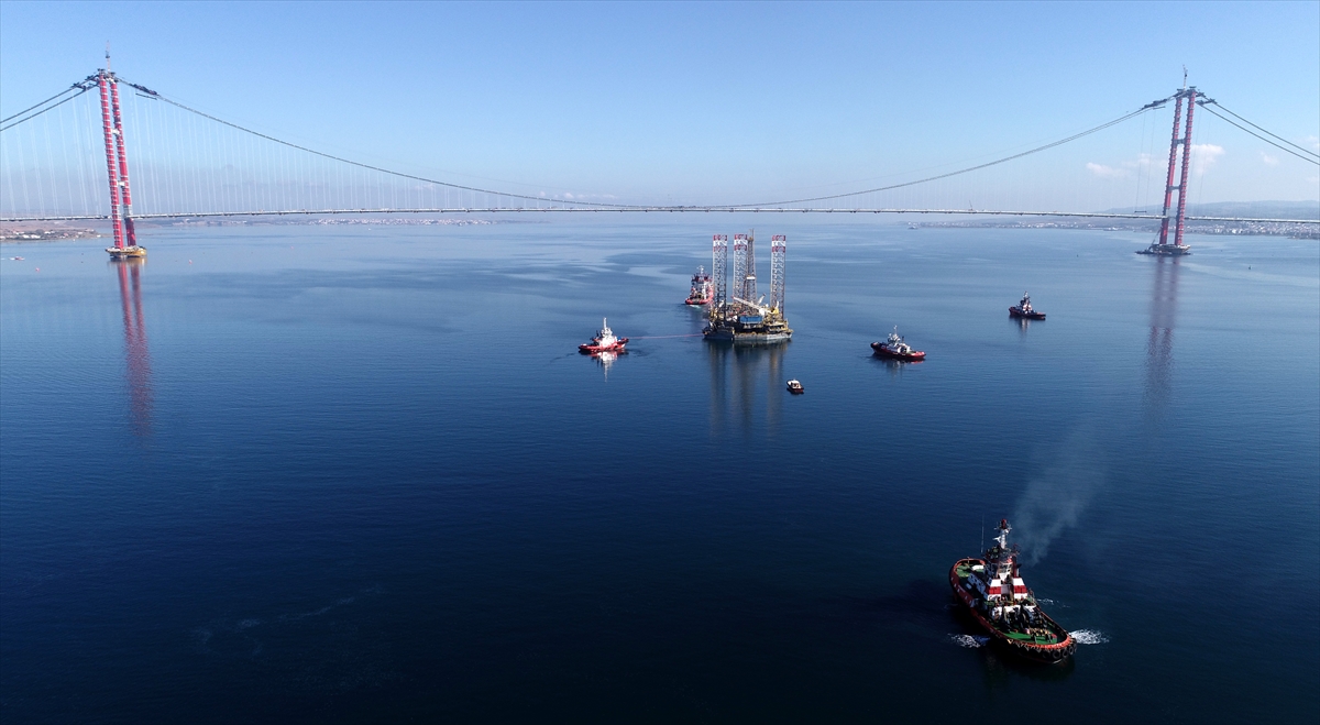 BOTAŞ Genel Müdürlüğü uhdesinde yürütülen "Kuzey Marmara Doğalgaz Depolama Tevsi (Faz 3) Projesi İkmal İnşaatı"nda kullanılacak, “Aras Diriller” isimli platform, suya batırılma işleminin ardından Nene Hatun römorkörü tarafından çekilerek, “1915 Çanakkale Köprüsü”nün altından geçirildi.