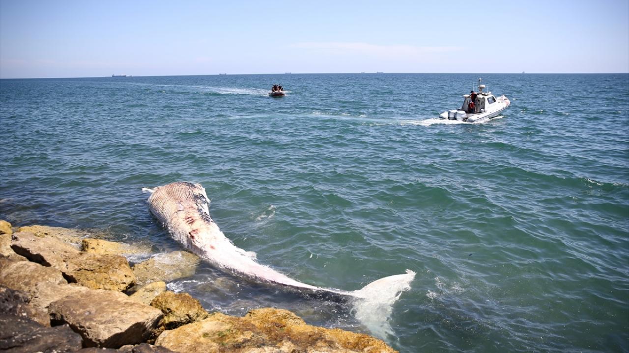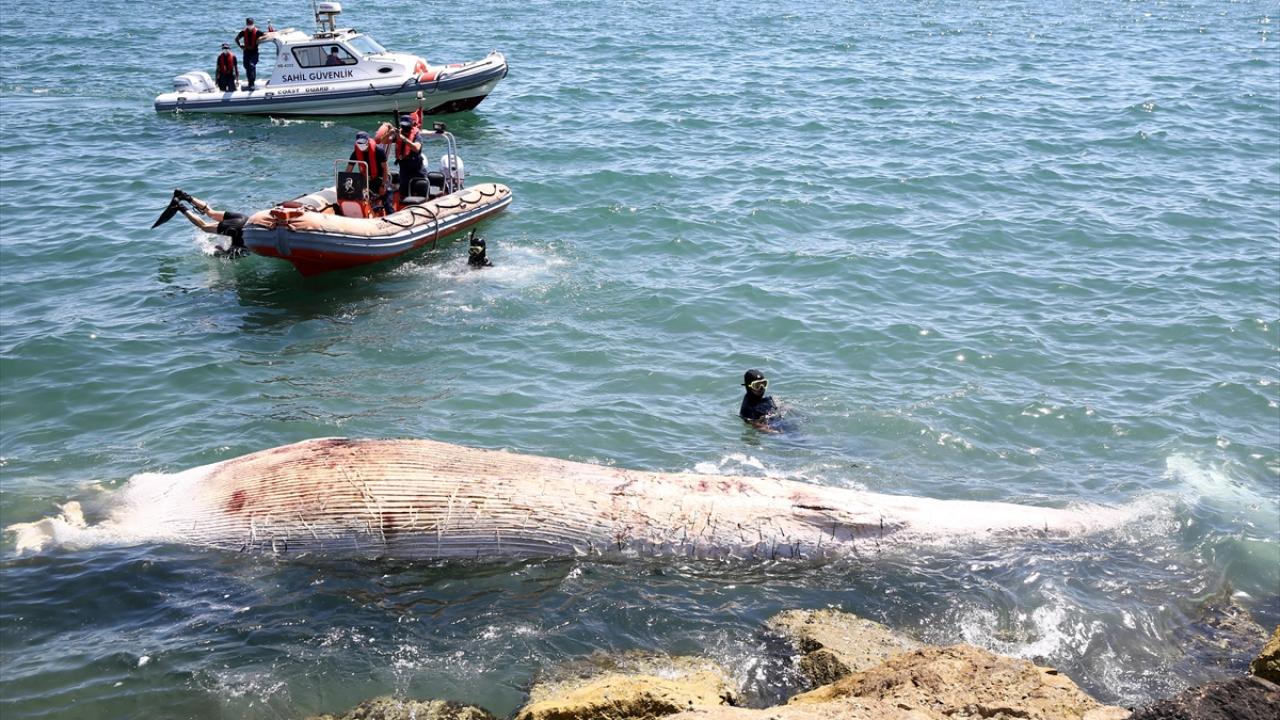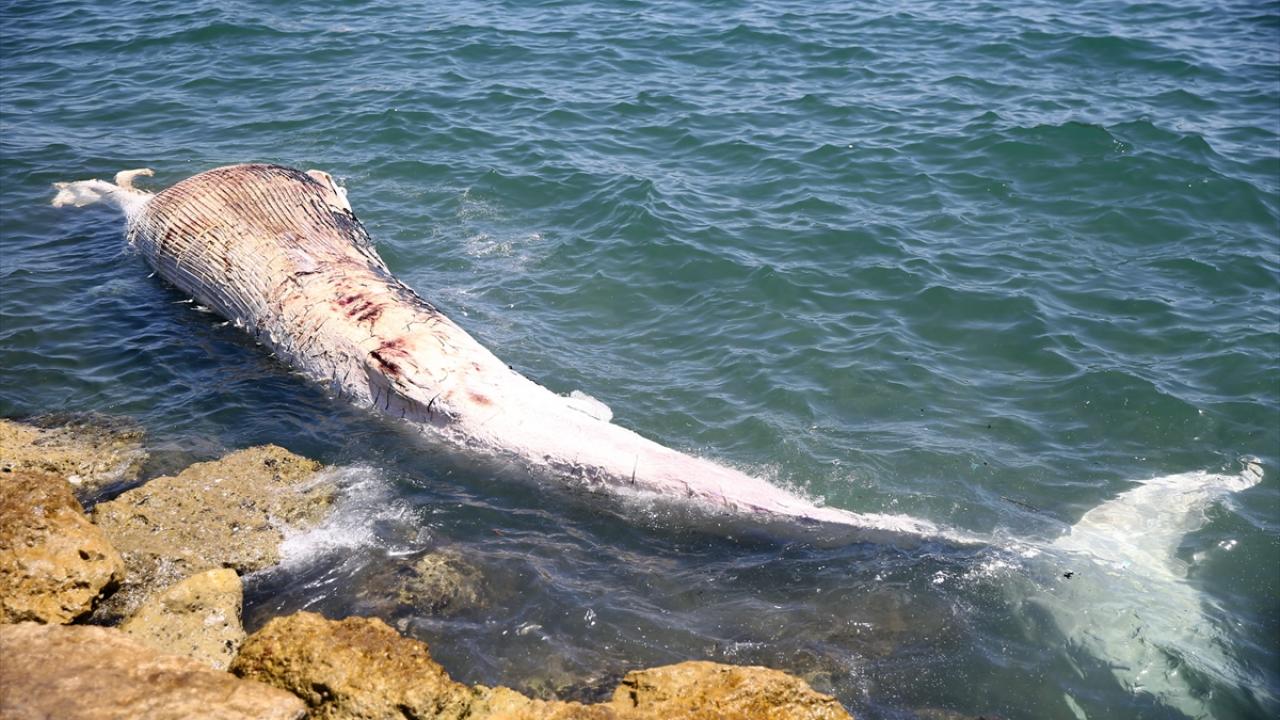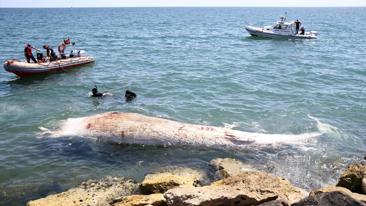 Mersin sahiline, telef olmuş yaklaşık 14 metrelik oluklu balina vurdu. Balinanın taşınması için Sahil Güvenlik Akdeniz Bölge Komutanlığı ekipleri çalışma yaptı.