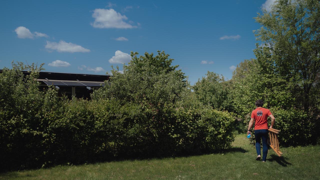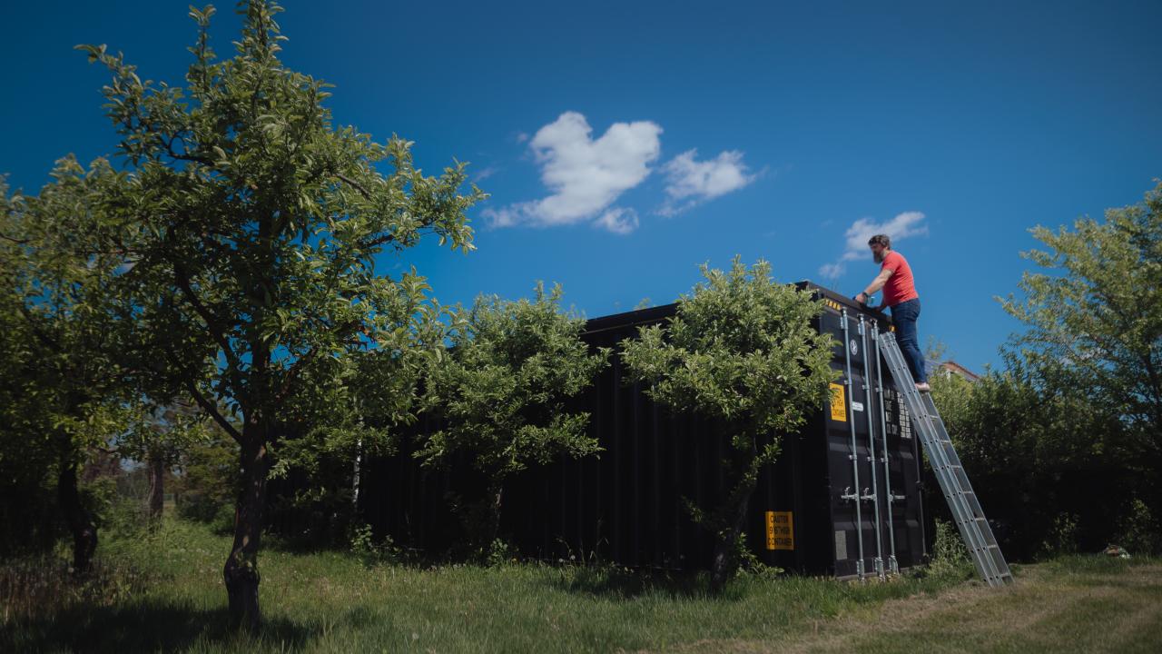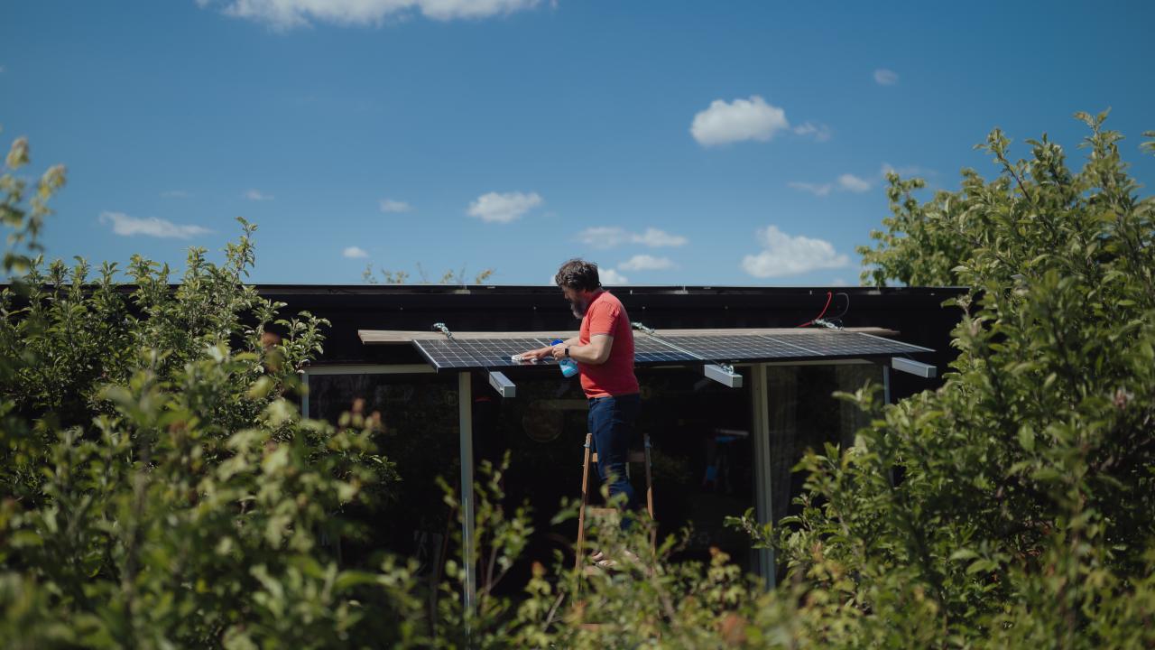 Yaşadığı çevre dostu evinin (eko-ev), sadece güneş panelleriyle çalışan eko stüdyosunun çatısını temizlerken görüntülendi.