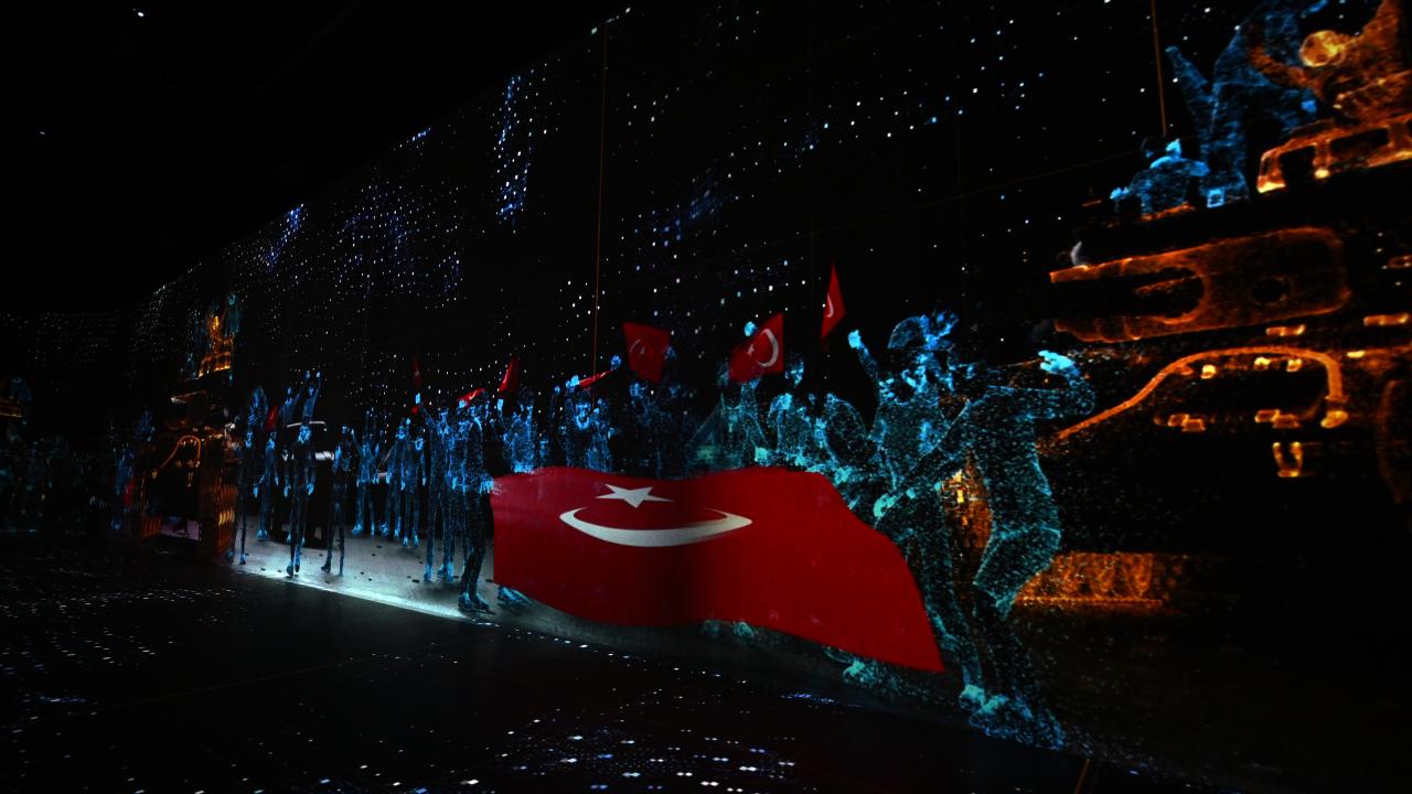 Ziyaretçiler, 15 Temmuz darbe girişiminin başlamasından önlenmesine kadarki süreçte yaşananları, video projeksiyon uygulamasıyla "En uzun gece" salonunda izleyebiliyor.