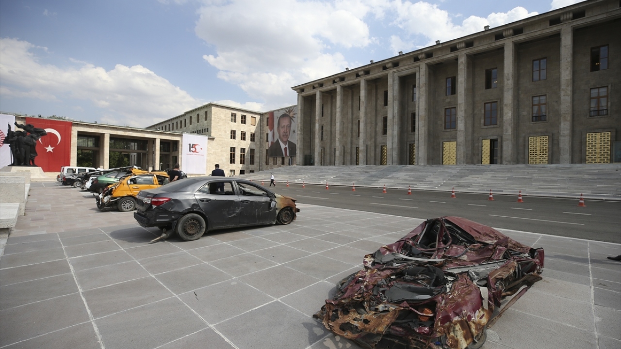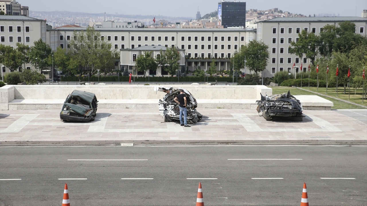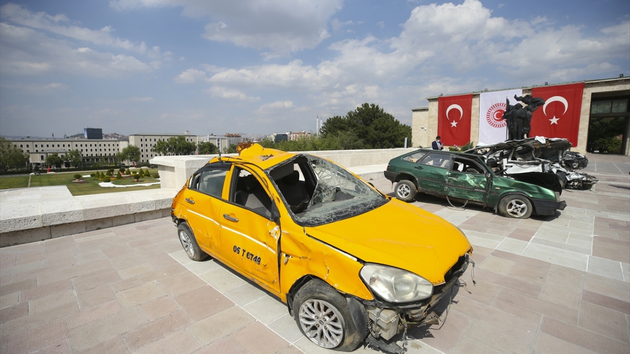 Sergilenen hasarlı araçlar arasında tanklar tarafından ezilen, uçak ve helikopterlerden açılan ateşle vurulan ticari taksi, polis araçları ve vatandaşlara ait otomobiller yer alıyor.
