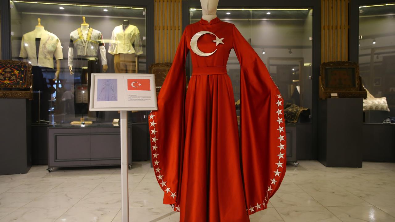 3 yılda hazırlanan Türk devletlerine ait kıyafetlerle Türkiye Cumhuriyeti`ni temsil eden Türk Bayrağı motifi üzerine işlenen 100 yıldızlı elbise, "Cumhuriyet, Bayrak ve 16 Türk Devleti" temalı düzenlenen etkinlikte sergilendi.