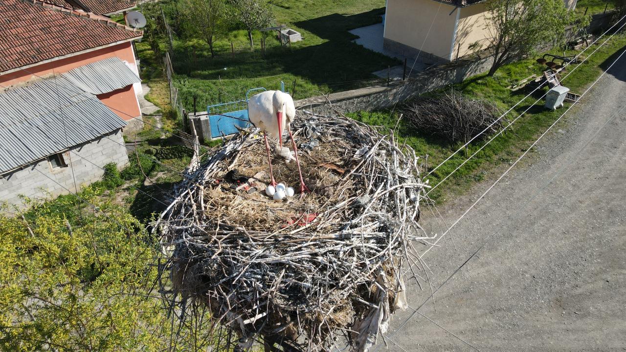 Mertekli köyünde 17 yıldır aynı yere yuva yapan leylekler de bu yıl yine eski muhtar Mehmet Fırat`ın evinin önündeki elektrik direğinde kuluçkaya yattı.
