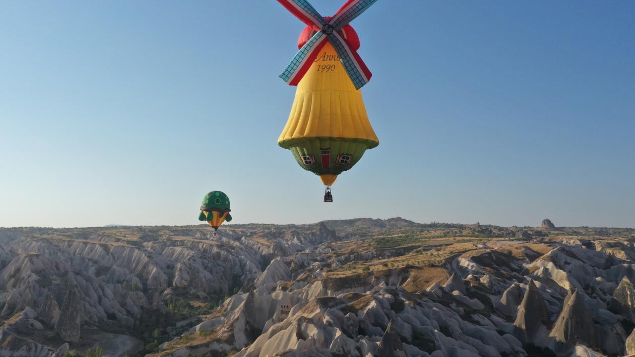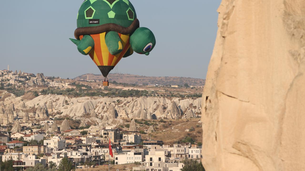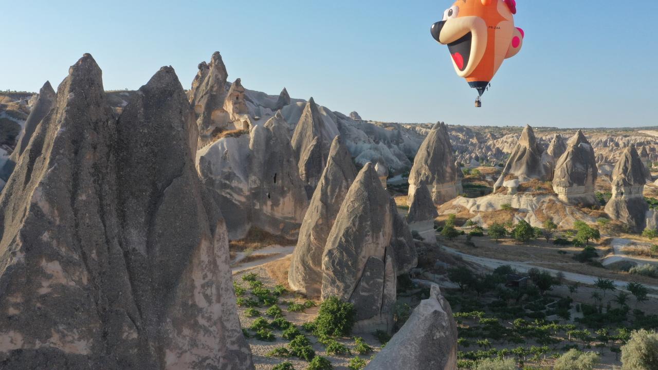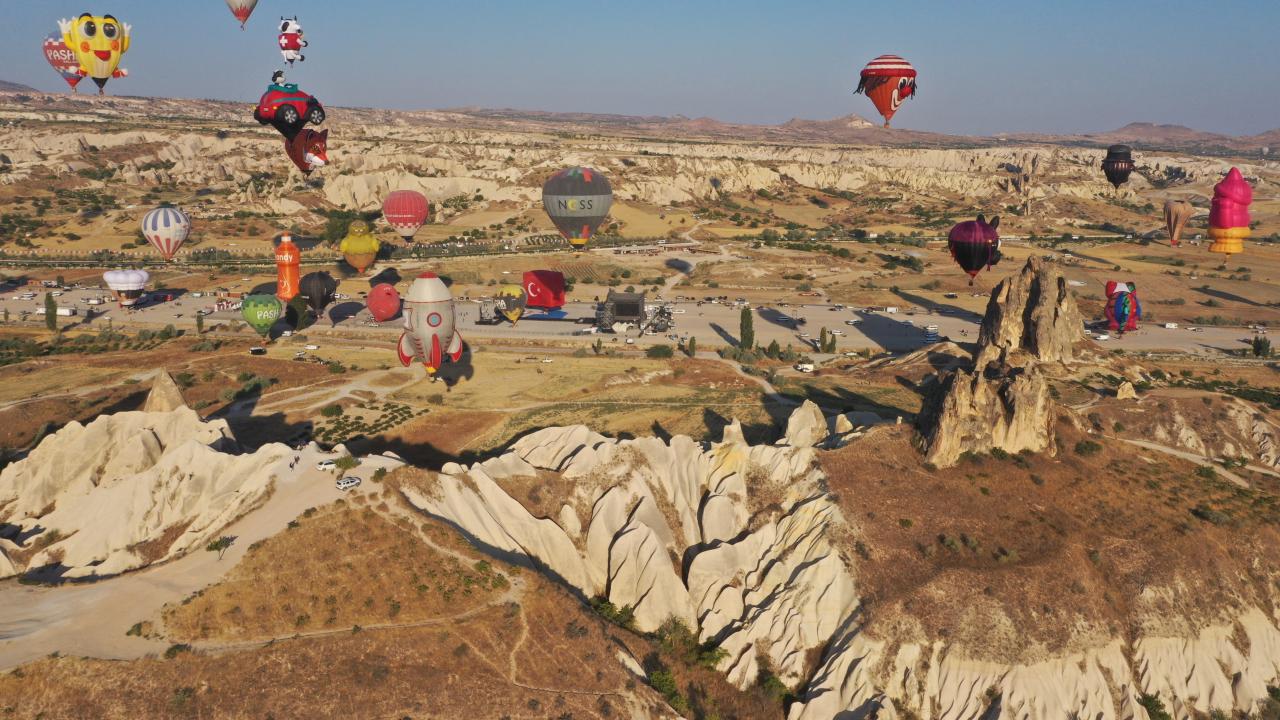 "Kurbağa", "fil", "kaplumbağa, "roket", "kalp", "kurt", yer değirmeni" gibi 60 figürlü balon Göreme beldesinden kalkış yaptıktan sonra vadiler üzerinde yaklaşık 45 dakika boyunca uçtu.