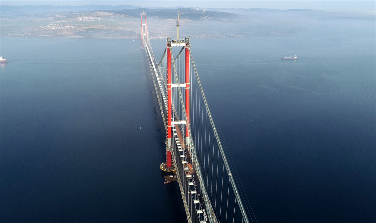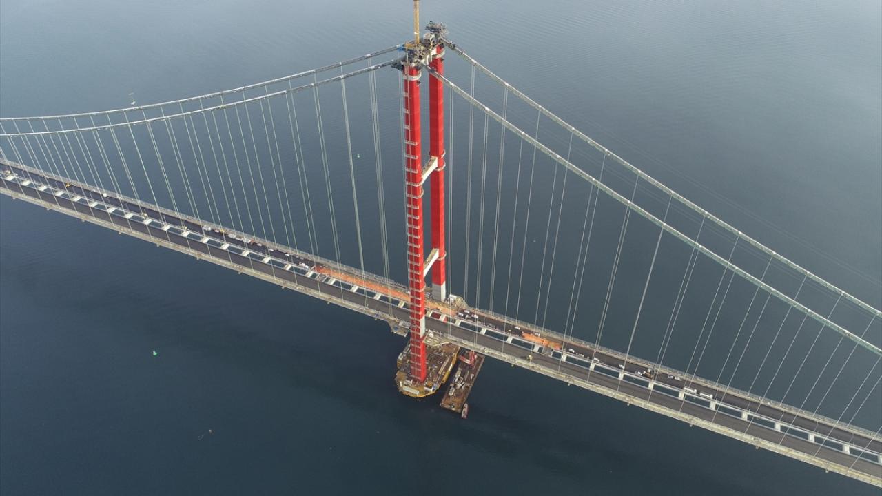 1915 Çanakkale Köprüsü hariç, otoyol kesimi ve yaklaşım viyadüklerinin tamamı aşınma seviyesinde tamamlanırken asma köprüdeki üstyapı imalatları gerçekleştiriliyor.