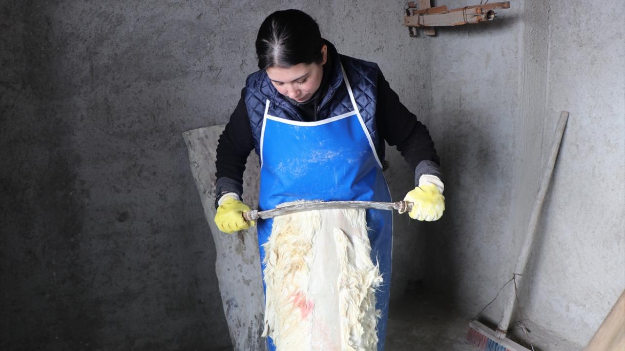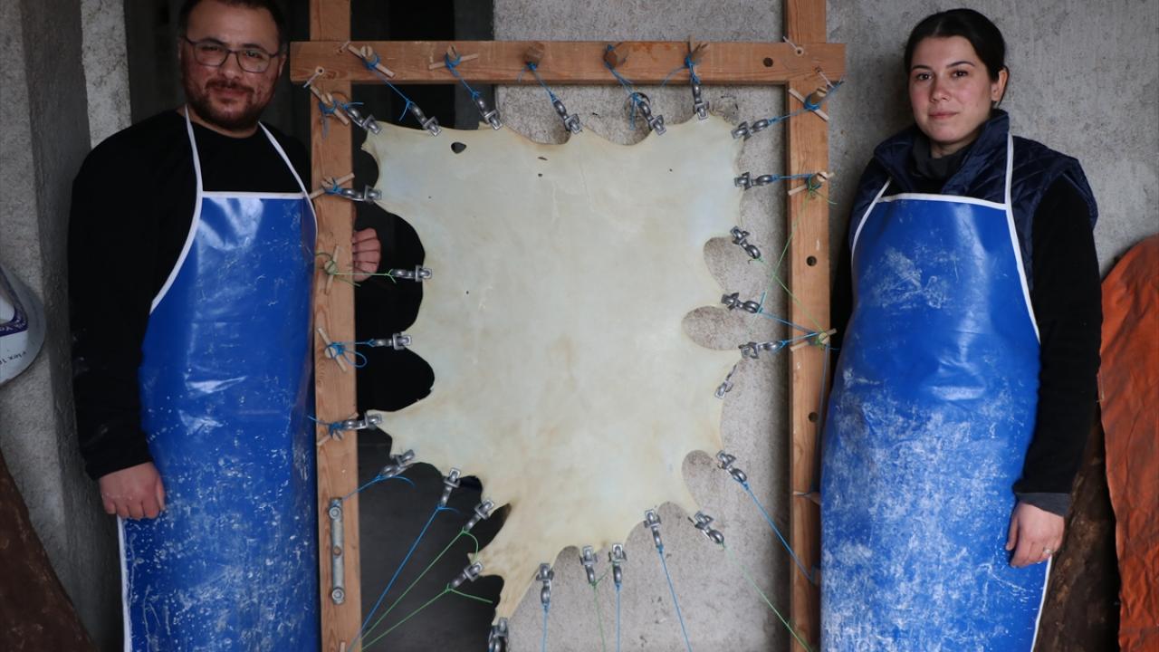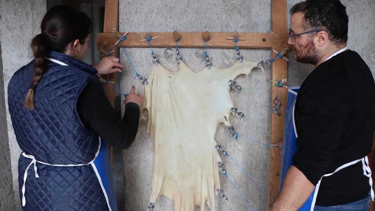 Tabakhaneden aldıkları oğlak derilerini 10 gün kireçli suda beklettiklerini, kavaleta bıçağıyla üzerindeki tüyleri sıyırdıklarını anlatan Demirel, çerçeveye gerdikleri deriyi inceltme bıçağıyla kazıyarak parşömen haline getirdiklerini anlattı.