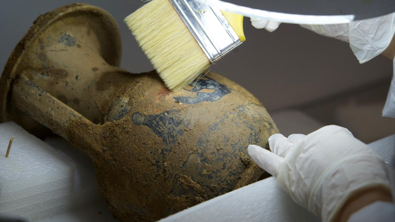 Hiç bozulmamış halde günümüze ulaşan lahit mezarda bulunan eşyalar özenle çıkarılıp temizlenerek korumaya alınıyor.
