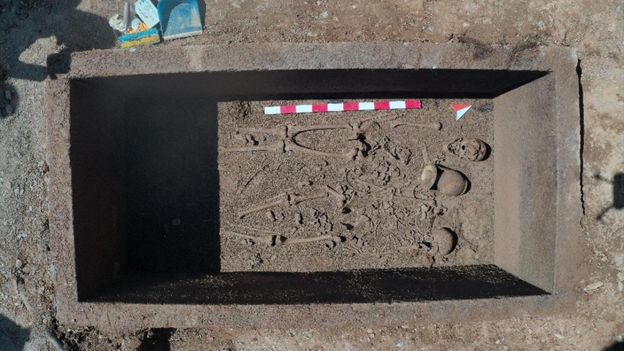 Çalışmalar sırasında bölgede bugüne kadar 12 basit tipte mezar ile bir lahit mezar tespit edildiğini aktaran Toprak, emsallerinden daha büyük boyutlu olan mezarın kapağı kaldırıldığında ise iki iskeletle karşılaşıldığını dile getirdi.