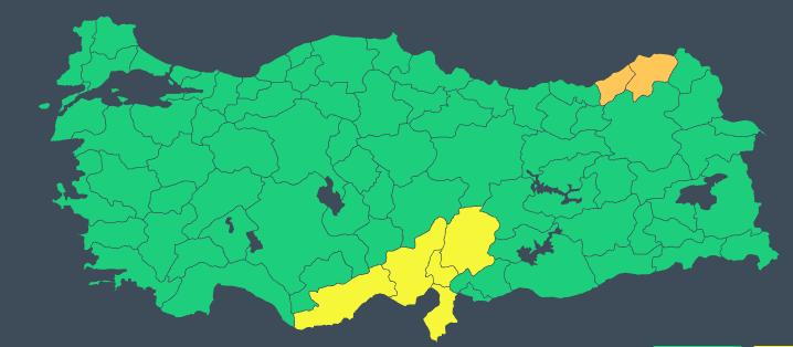 Hava durumu tehlikelidir: Tahmin edilen meteorolojik hadise sıklıkla görülmemektedir. Hasar ve kayıpların oluşması muhtemeldir. Çok tedbirli olmalı, güncel meteorolojik koşullar ve tahminler takip edilmelidir.