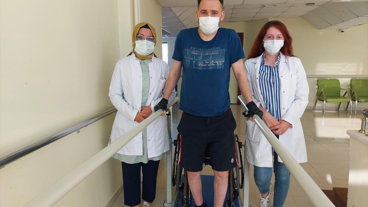 Kütahya'nın Tavşanlı ilçesinde 20 yıl önce geçirdiği trafik kazasında omurgasının kırılması nedeniyle yürüme yetisini kaybeden Abdullah Yiğit, tedavisinin ardından yeniden adım atabilmenin mutluluğunu yaşıyor.
