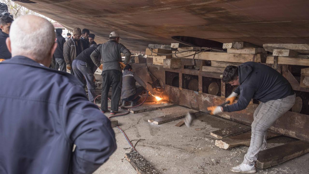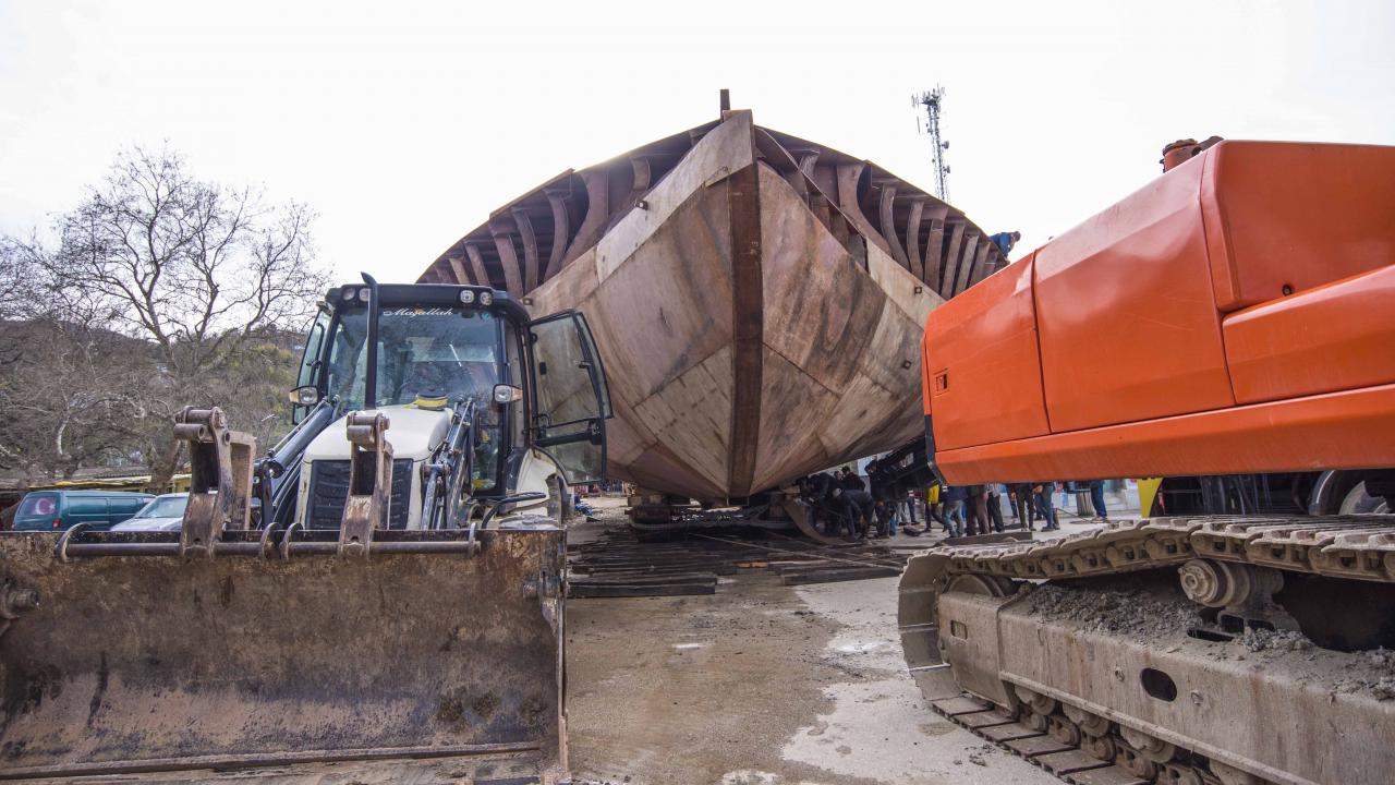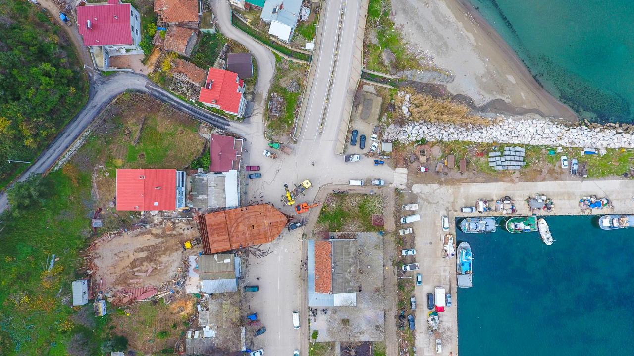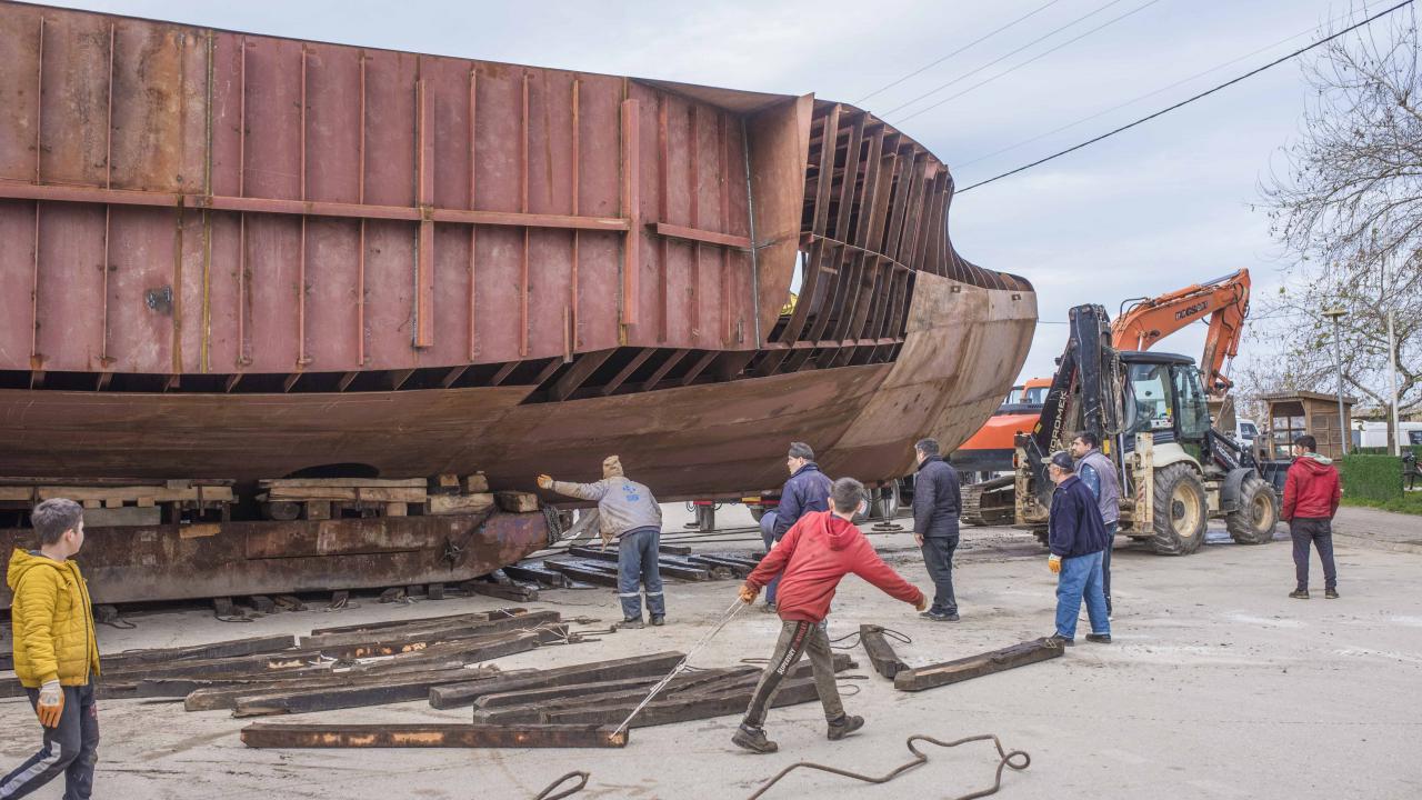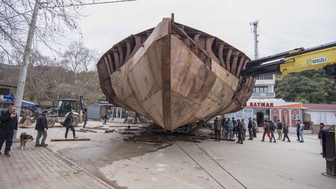 Limana, karadan yürütülerek götürüldü. Diğer parçalar limanda monte edilecek. Ardından tekne suya indirilecek.
