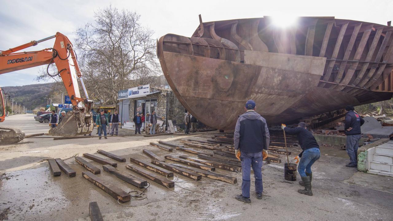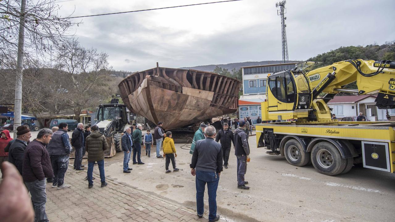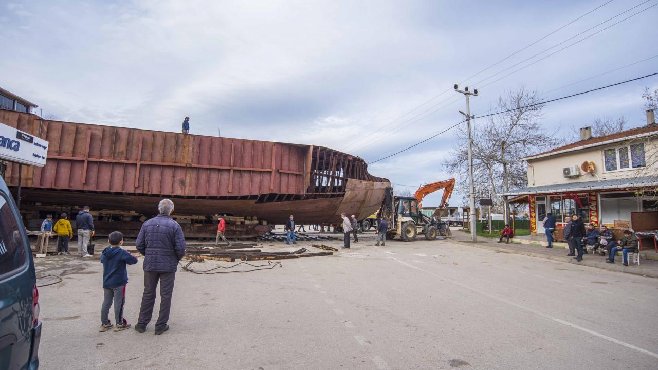 Bursa'da inşa edilen 200 tonluk balıkçı teknesi karadan yürütülerek liman sahasına ulaştırıldı. 40 kişilik ekip devasa tekneyi 3 kepçe ve 3 traktör yardımıyla 10 saatte taşıdı.