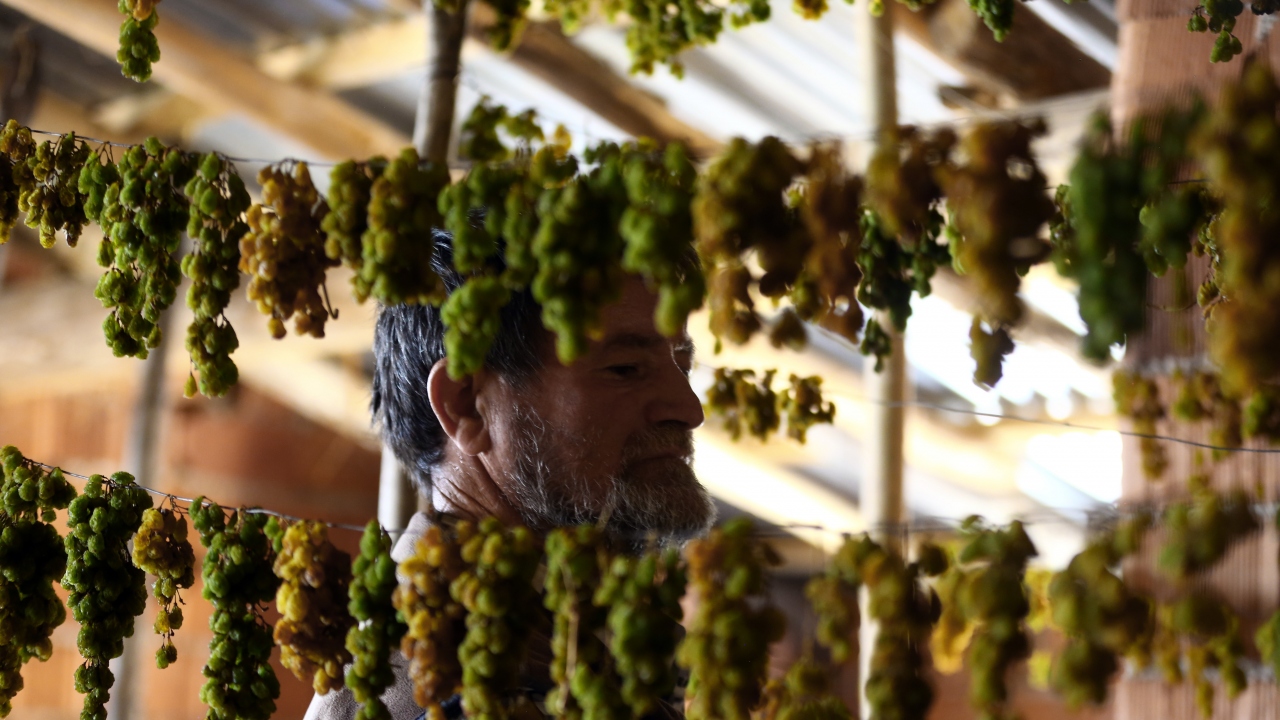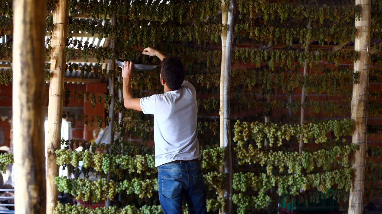 Yaklaşık 100 haneli mahallede üzümler, güneş görmemesi için evlerin tavan arasında kurutuluyor. Gölgede kuruduğu için yeşil rengini muhafaza eden gök üzüm, benzersiz rengi ve tadıyla ilgi görüyor.