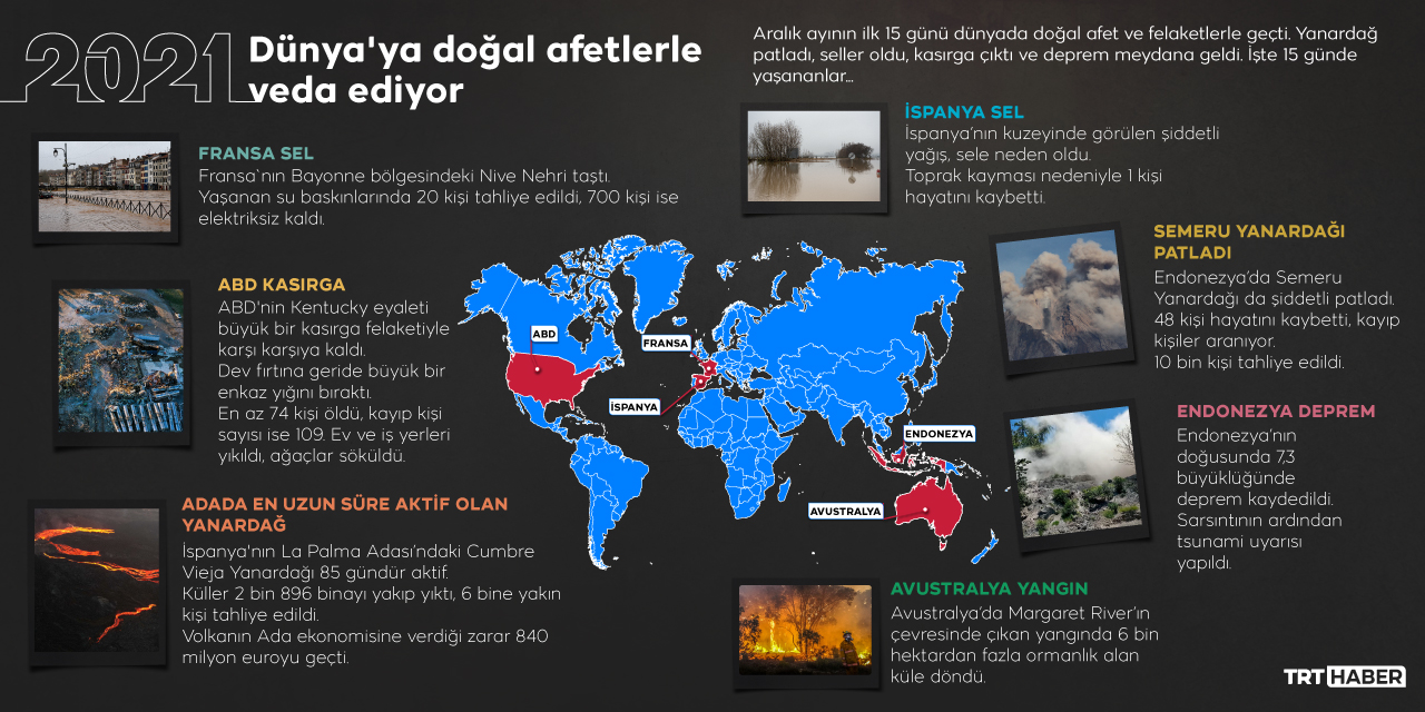 Aralık ayının ilk 15 günü dünya genelinde doğal afetler ve felaketlerle geçti. Hemen ilk günlerinde Endonezya'da yanardağ patladı ve onlarca kişi öldü. Ardından Avustralya'da yangınlar çıktı ve binlerce hektar alan yandı. İspanya ve Fransa seller yaşanırken, ABD kasırga felaketiyle sarsıldı. Kasırga ardında büyük bir yıkım bıraktı. Son olarak da bu sabah Endonezya'da deprem meydana geldi. İşte felaketler ve boyutları...