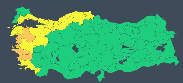 Meteoroloji, kuvvetli yağış ve fırtına nedeniyle 3 ili "turuncu", 18 kenti de "sarı" kodla uyardı. Yetkililer, sel, su baskını, muhtemel çatı uçması, ağaç ve direk devrilmesi, soba ve baca gazı kaynaklı zehirlenme riski ve ulaşımda aksamalar gibi olumsuzluklara karşı dikkatli ve tedbirli olunması gerektiği konusunda uyardı.
