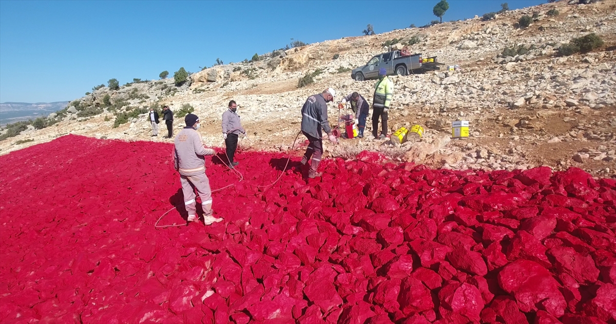 Mersin'in Mut ilçesinde 22 dönümlük araziye işlenen Türk bayrağının renginin yenilenmesi için 10 kişiyle başlatılan boyama çalışması 40 günde tamamlandı.