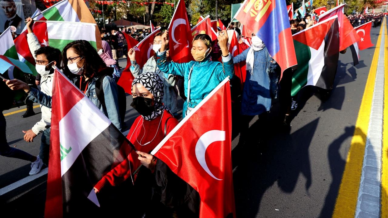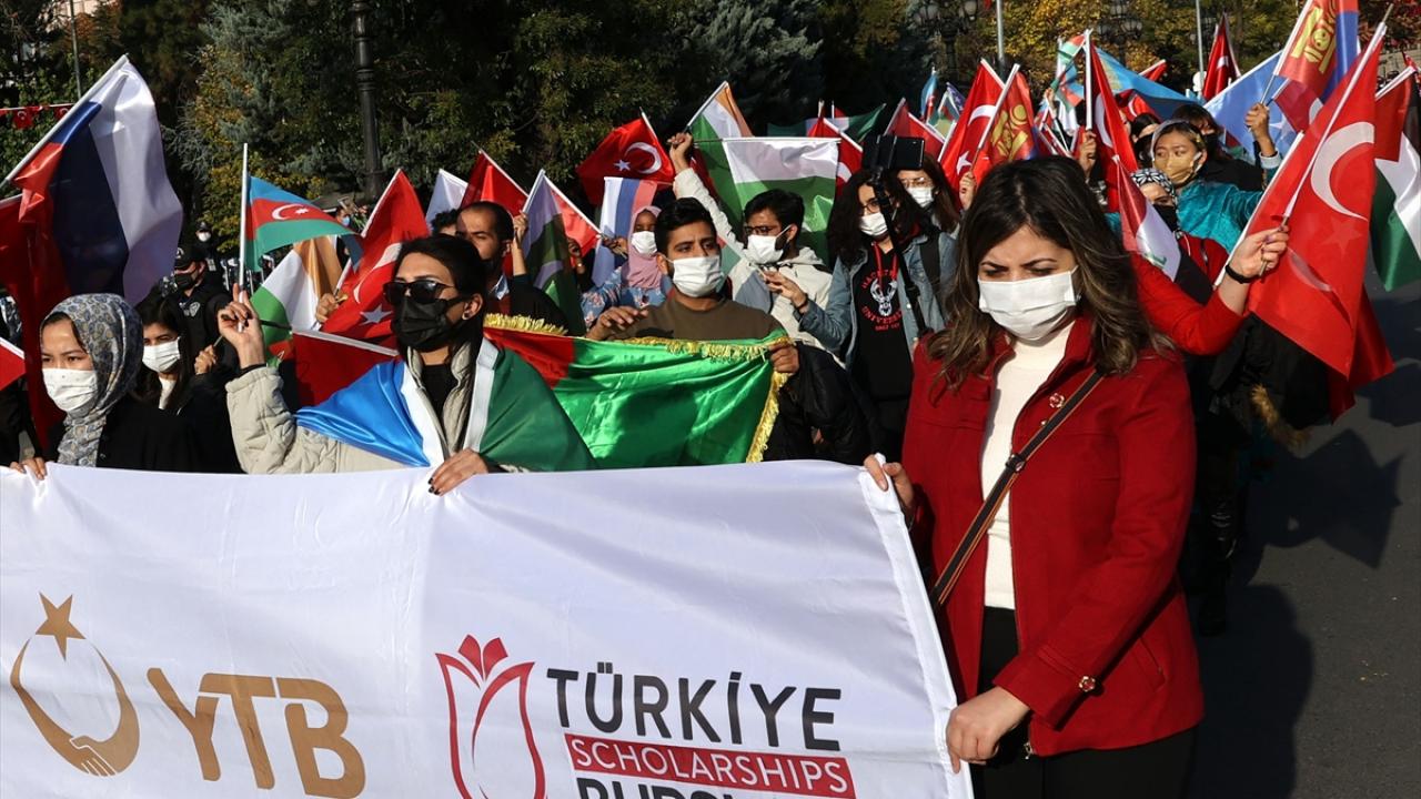 Korteje ellerinde kendi ülkeleri ve Türk bayraklarıyla katılan Türkiye burslusu uluslararası öğrenciler, "Türkiye" sloganı attı.