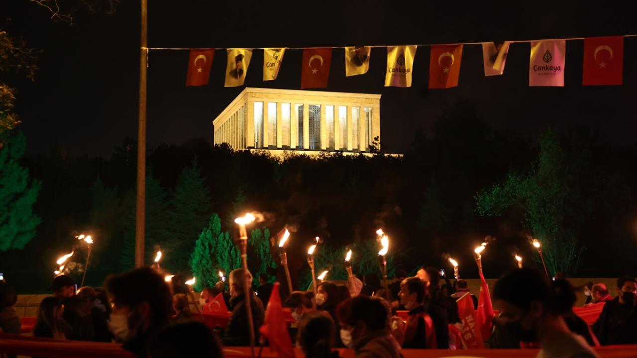 Türk bayrakları, Atatürk posterleri ve meşale taşıyan Ankaralılar; Ankara Tren Garı, Anadolu Meydanı ve Akdeniz Caddesi güzergahından Anıtkabir`e yürüdü.