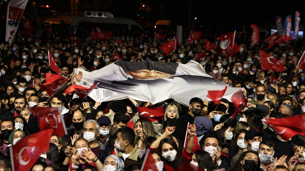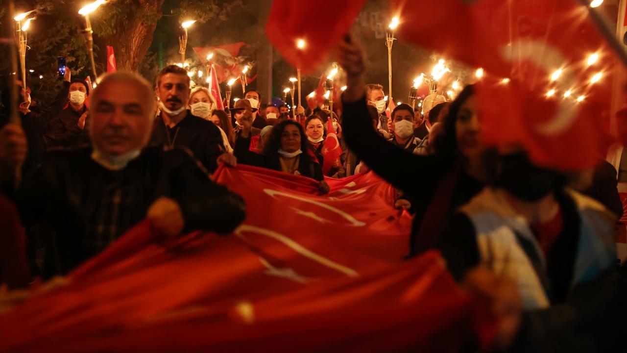 Ellerindeki meşaleleri yakarak bando eşliğinde yürüyüşe başlayan kalabalık, bir ağızdan "İzmir Marşı"nı söyledi.