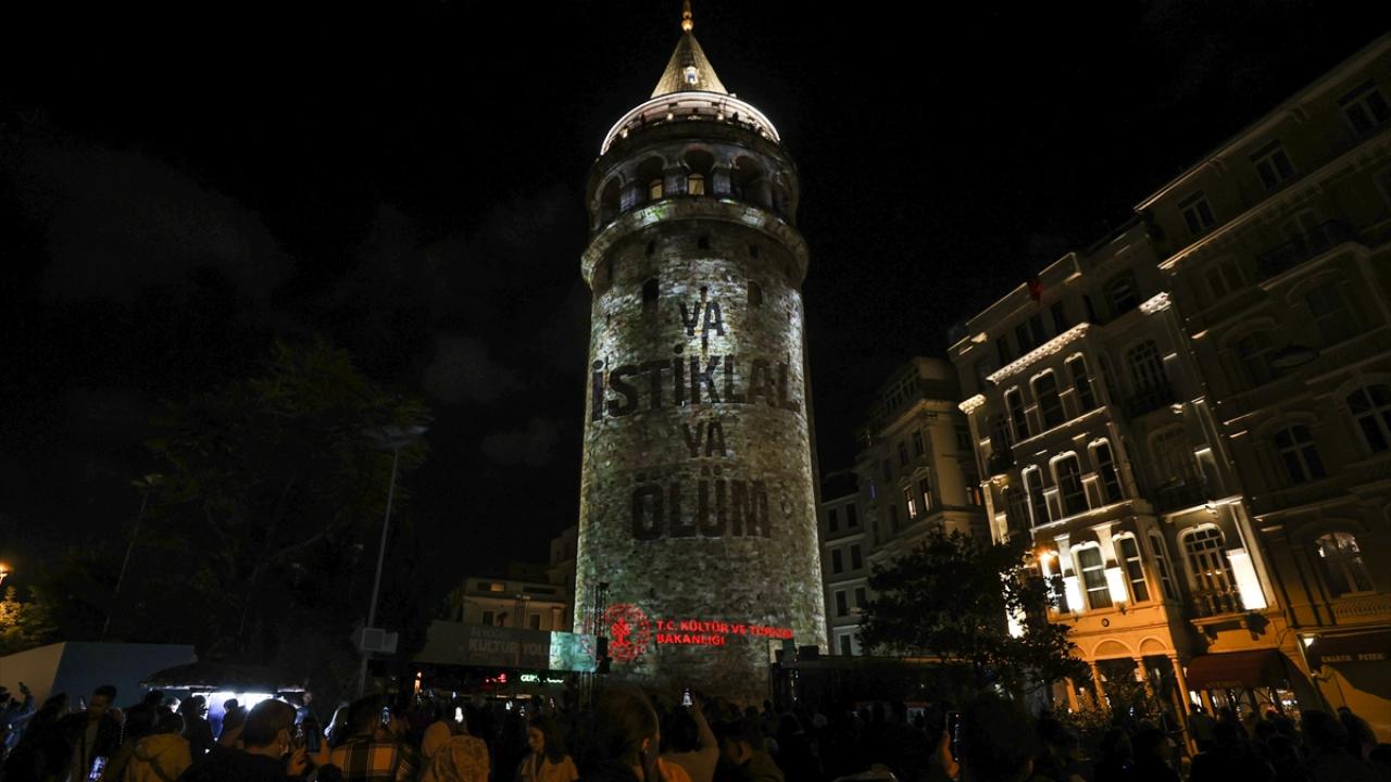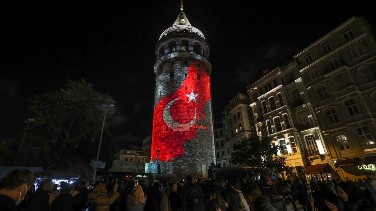 Kültür ve Turizm Bakanlığınca organize edilen etkinlikte, Türk bayrağı ve 29 Ekim Cumhuriyet Bayramı`na ilişkin görsellerin yer aldığı video kuleye yansıtıldı.