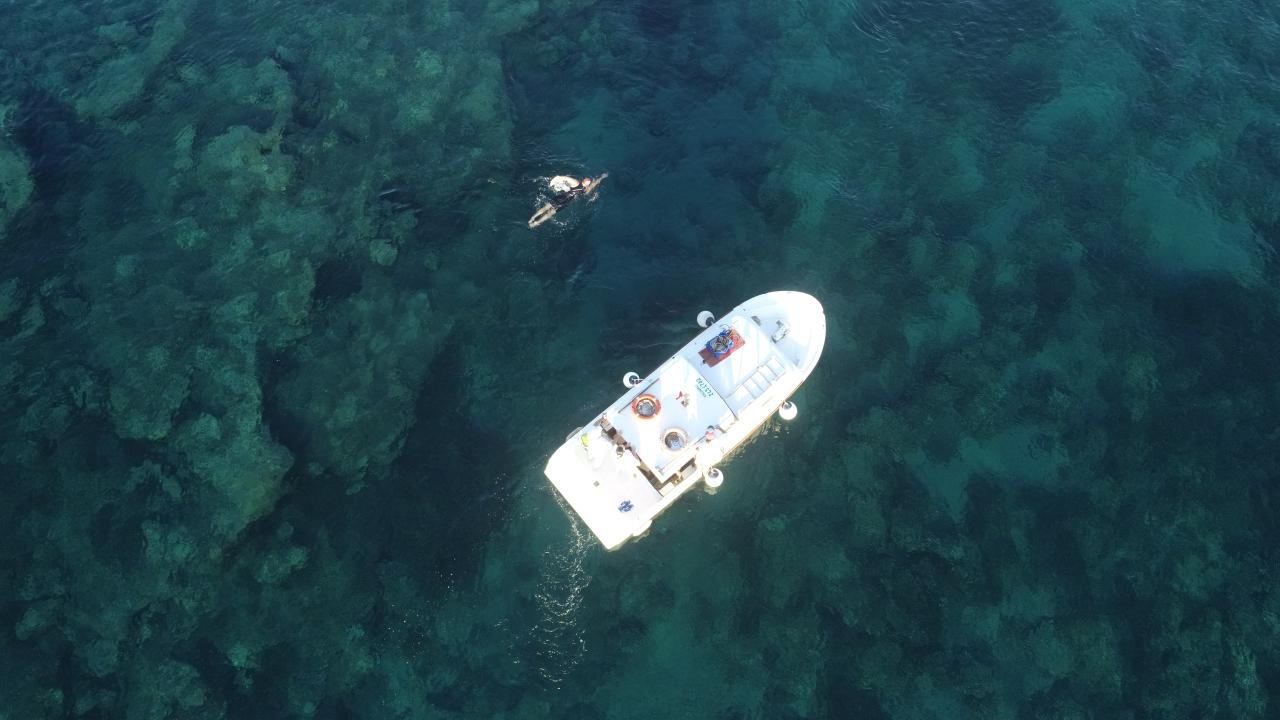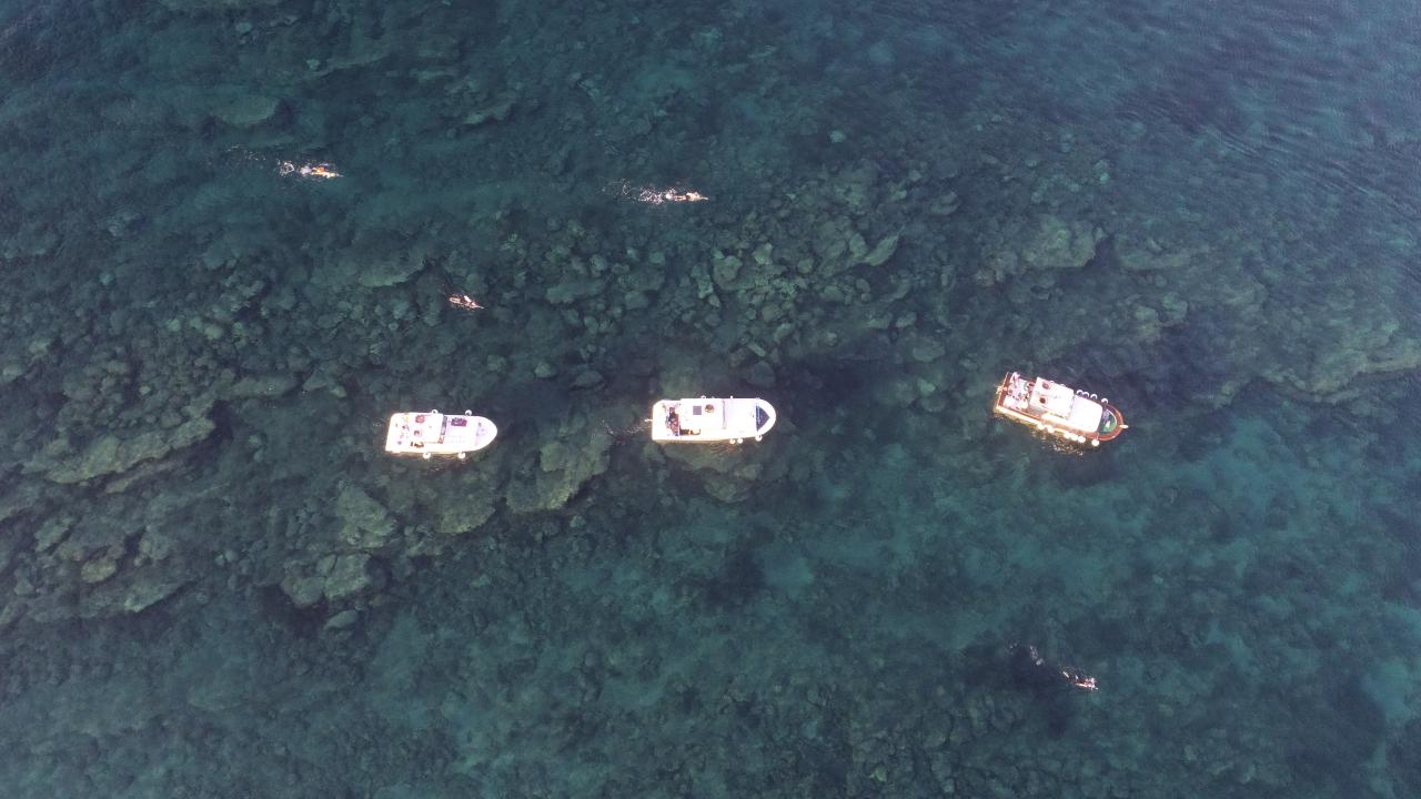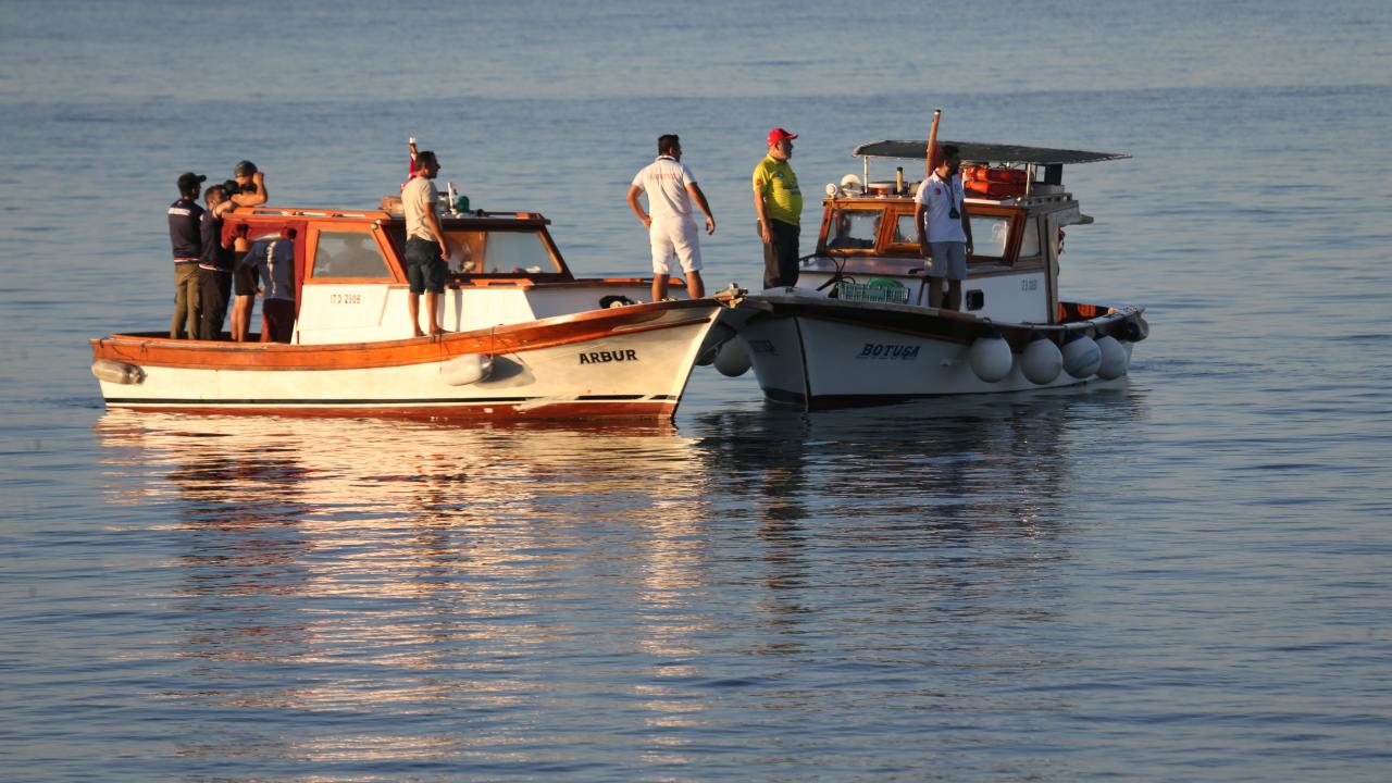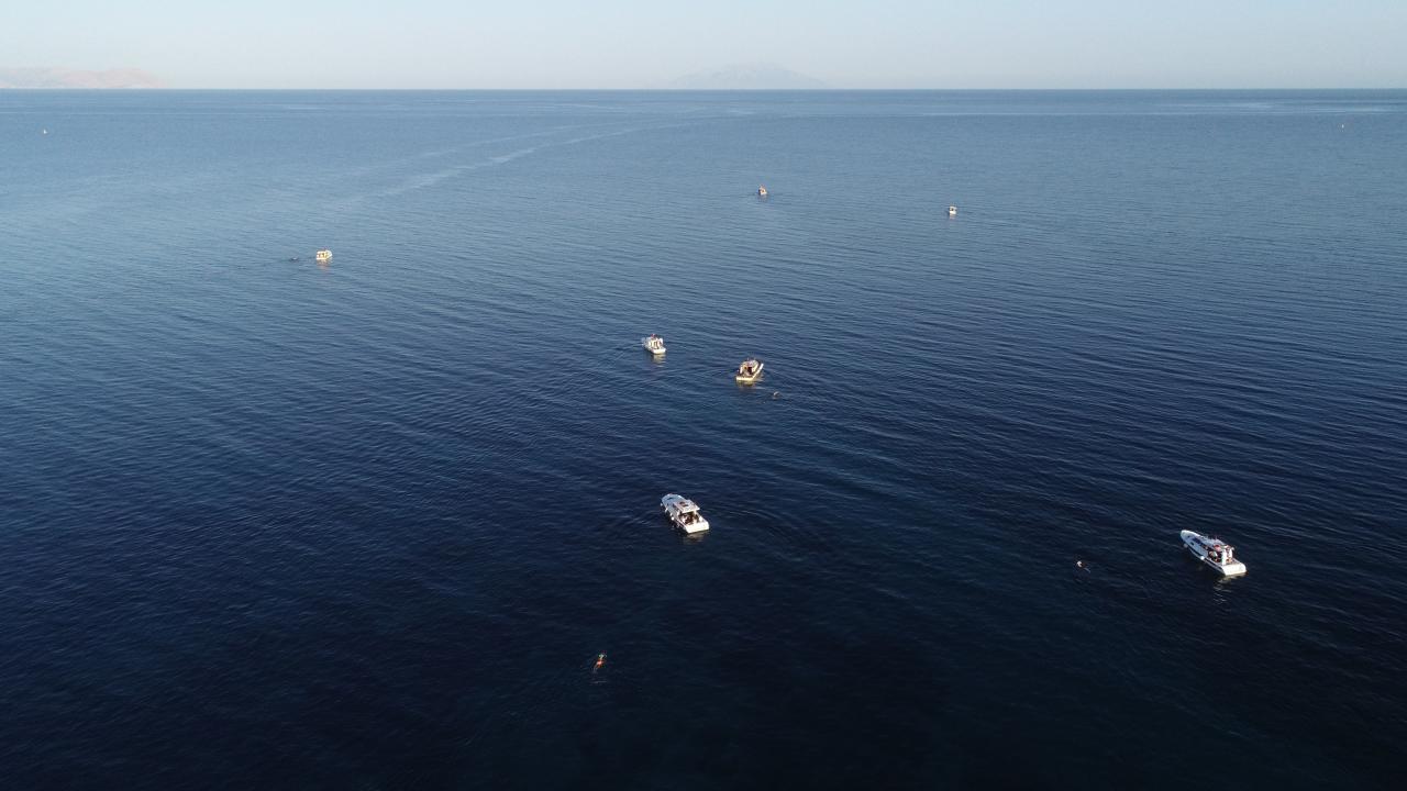 Sahil Güvenlik Komutanlığı ekibinin güvenlik önlemi aldığı maratonda sporculara tekneler eşlik ediyor.