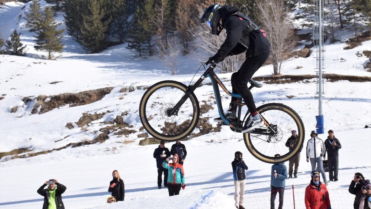 19 Şubat 2022`de Erzurum Büyükşehir Belediyesince Palandöken Kayak Merkezi`nde düzenlenen "Palandöken Snow Downhill" etkinliklerinde dağ bisikleti tutkunlarından oluşan 25 kişilik grup, Türkiye`nin gözde kayak merkezi Palandöken`de kristal karlar üstünde bisikletlerle pedal çevirerek dereceye girebilmek için kıyasıya yarıştı. (Arşiv)