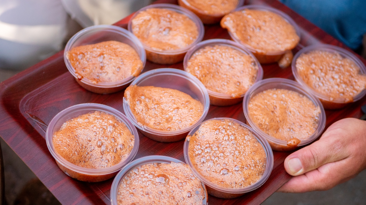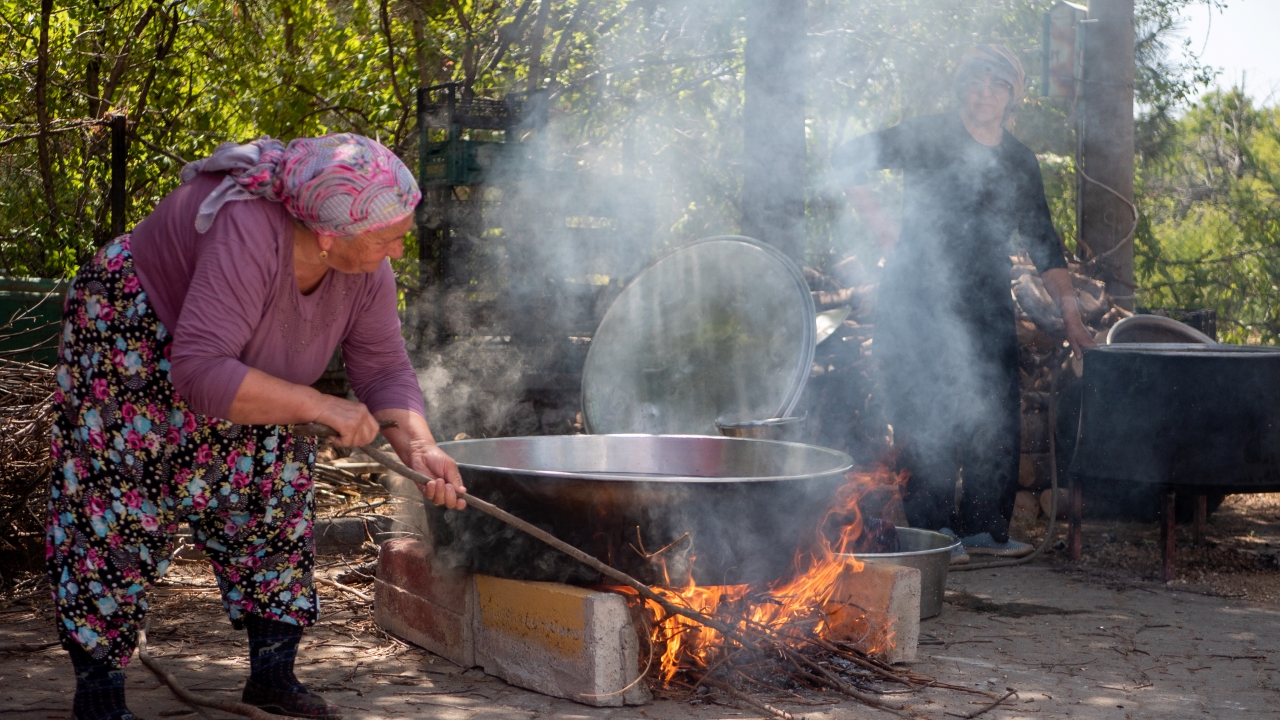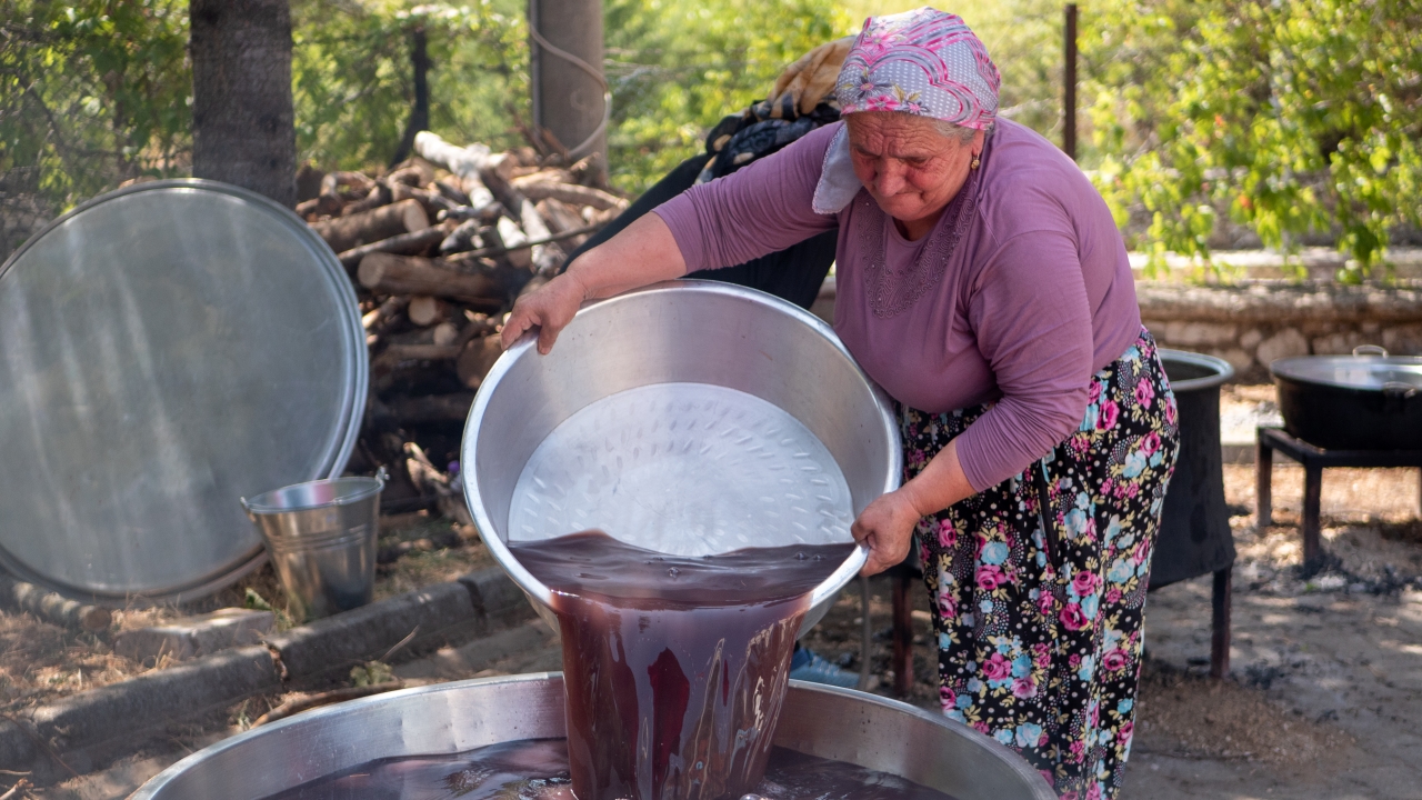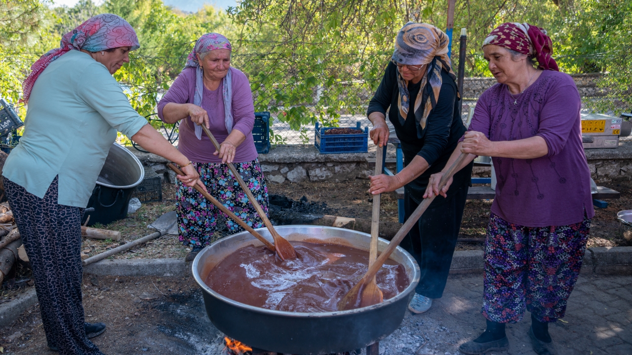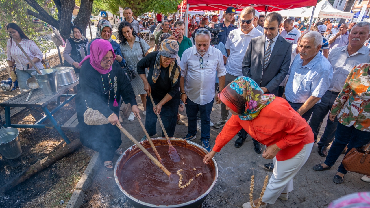 Kara kazanlarda ve odun ateşinde kaynatılarak şıra, pekmez ve köfter haline getirilen üzümler İbradı Belediye Başkanı Hatice Sekmen tarafından ziyaretçilere ikram edildi.
