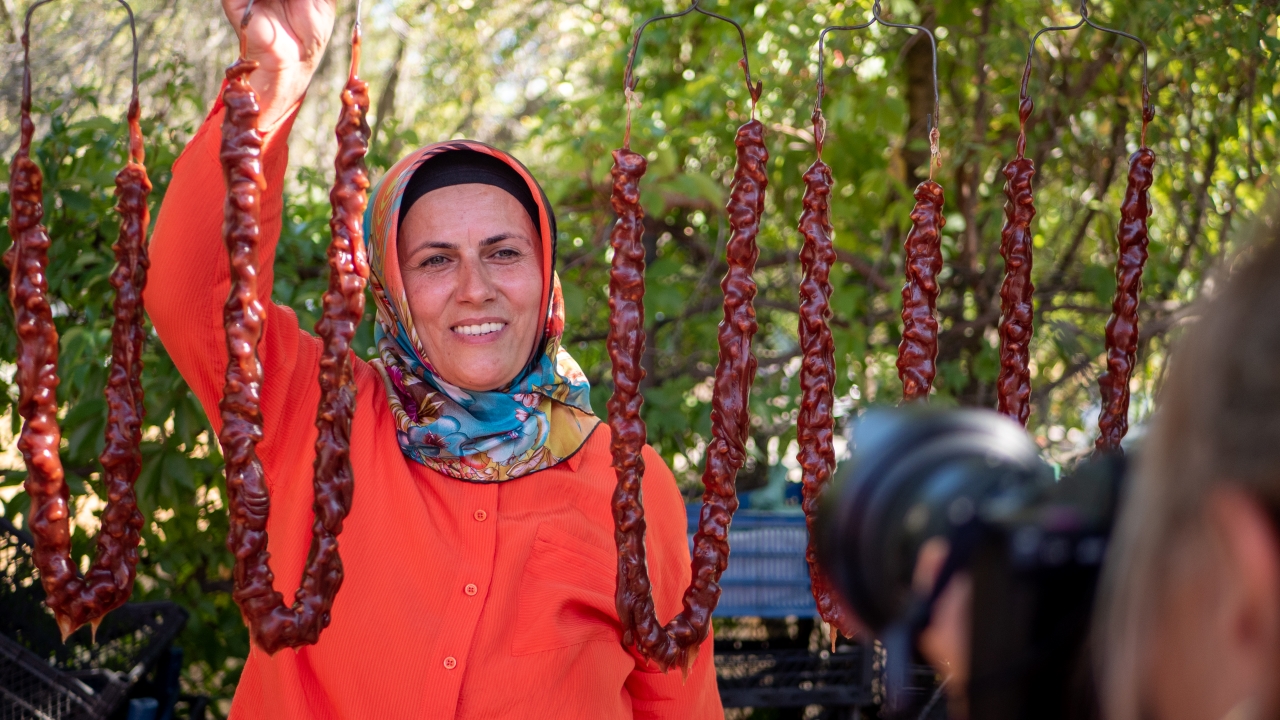 Üzümün sıkılmasından sofralara gelinceye kadar geçirdiği aşamaların sergilendiği bölümde yöre kadınları ter döktü.