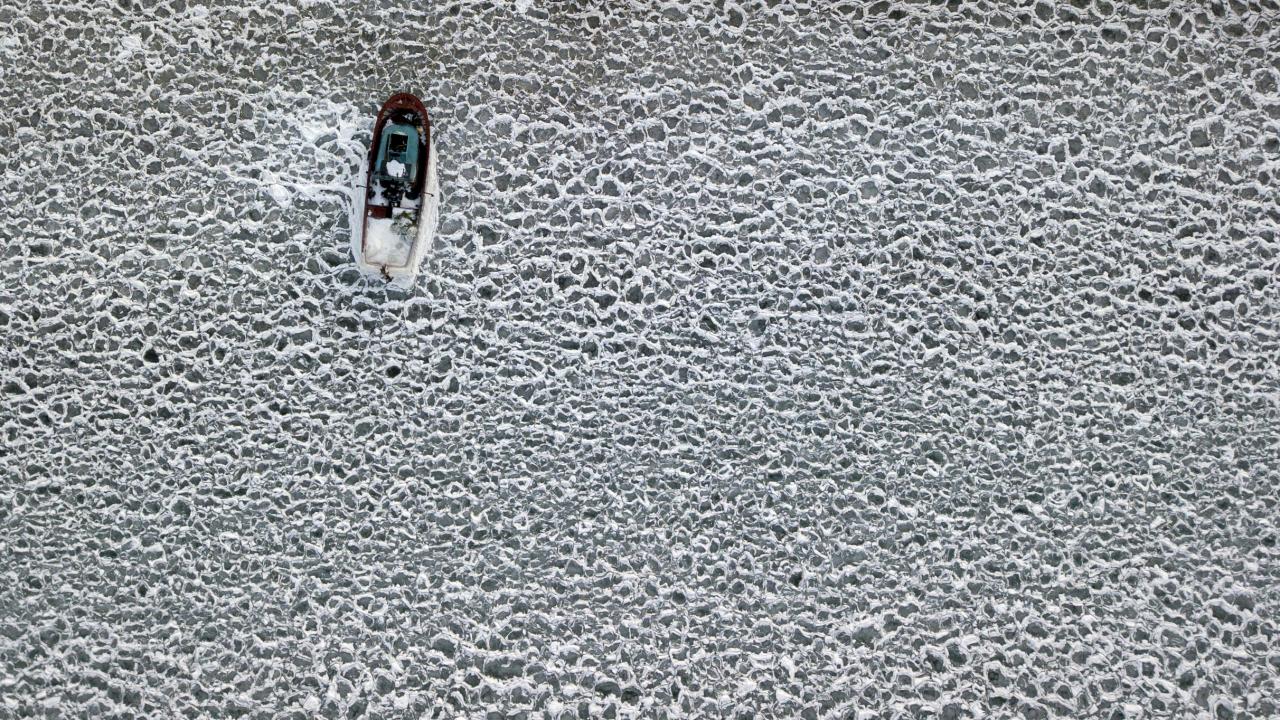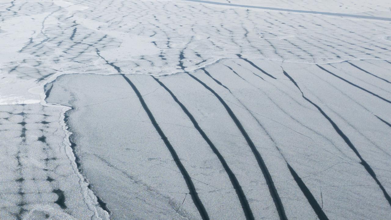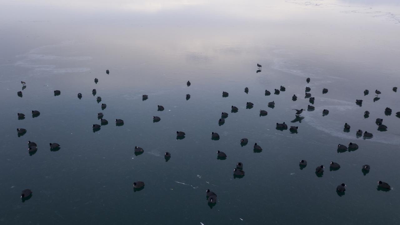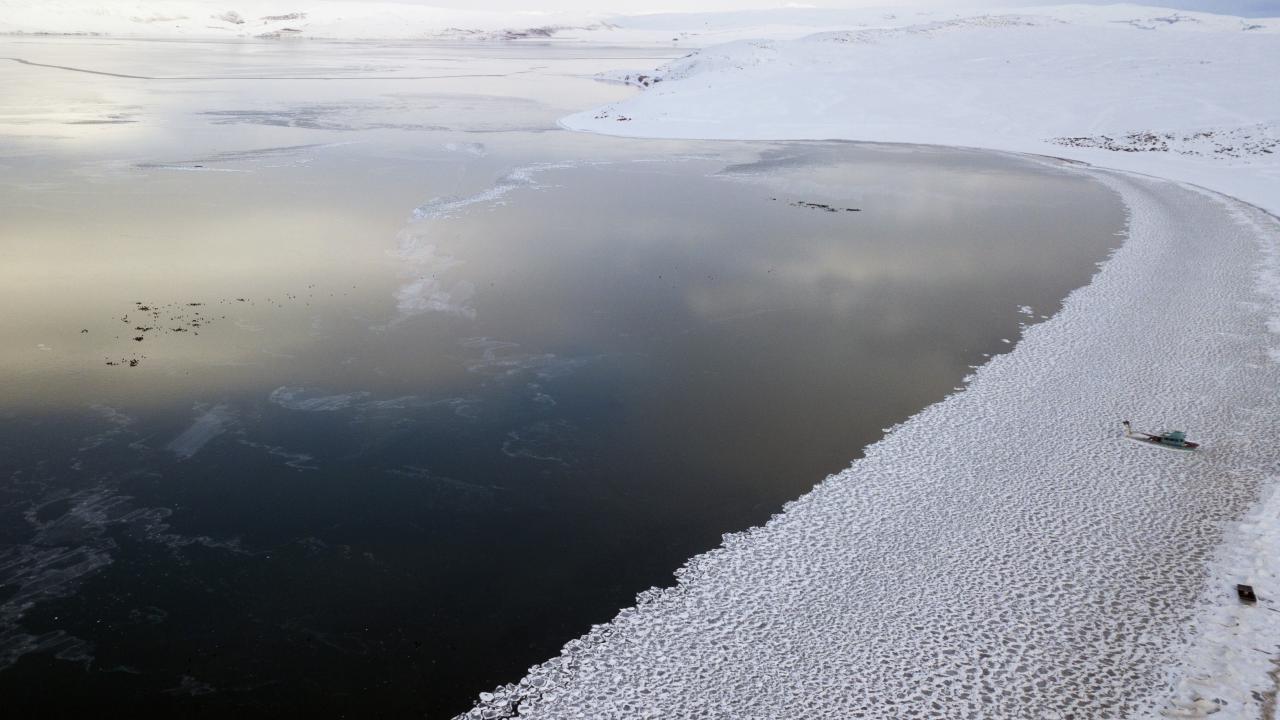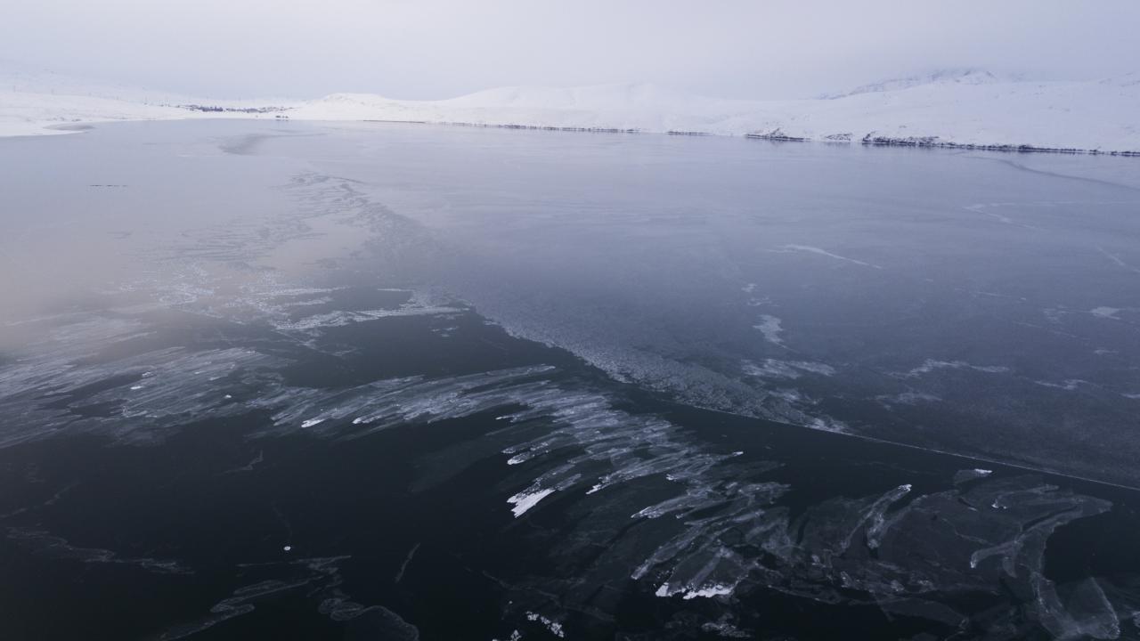 Hava sıcaklığının gece eksi 20 dereceye kadar düştüğü bölgede buzla kaplanan Nazik Gölü’nün değişik desenlere bürünen yüzeyi ve göl üzerinde yürüyen kuşlar havadan drone ile görüntülendi.