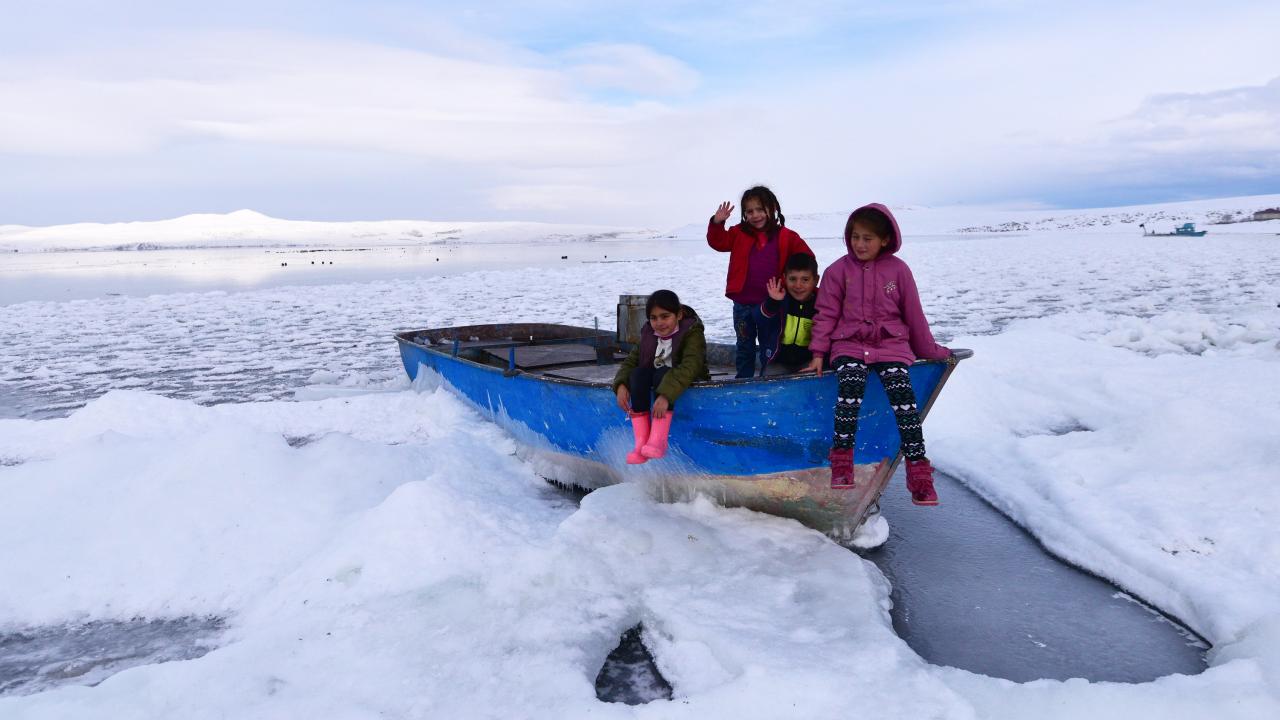 Göle kıyısı bulunan köylerdeki çocuklar ise buz tutan göl yüzeyinde oyunlar oynayarak eğleniyor.