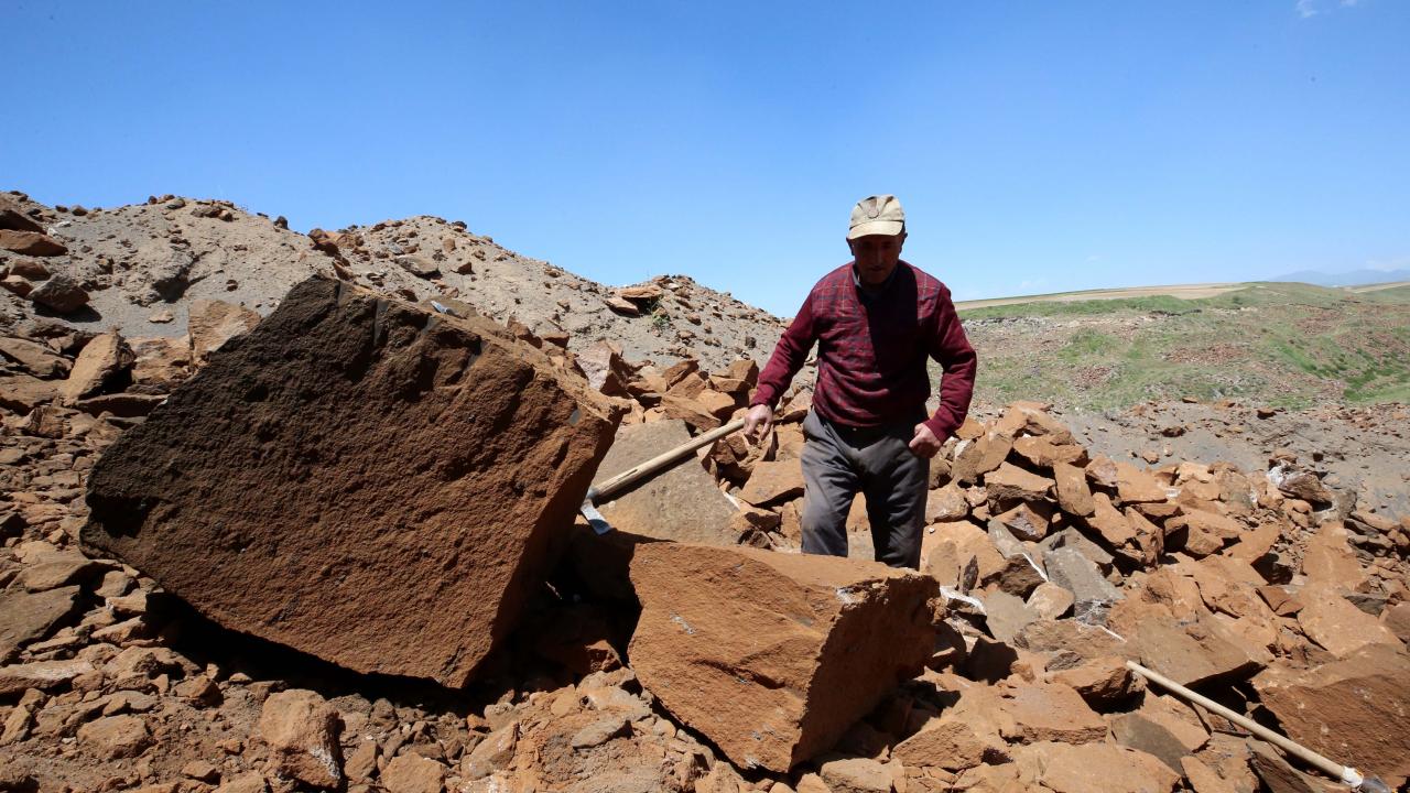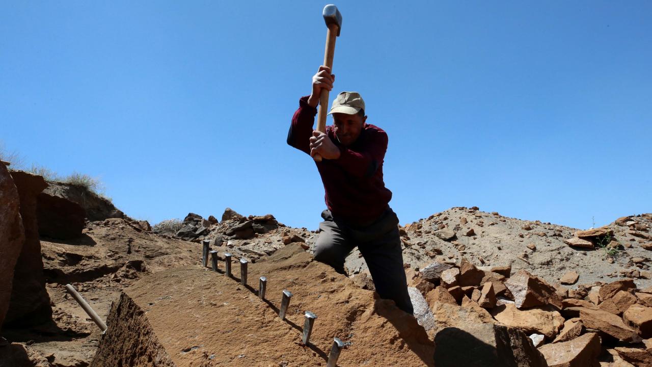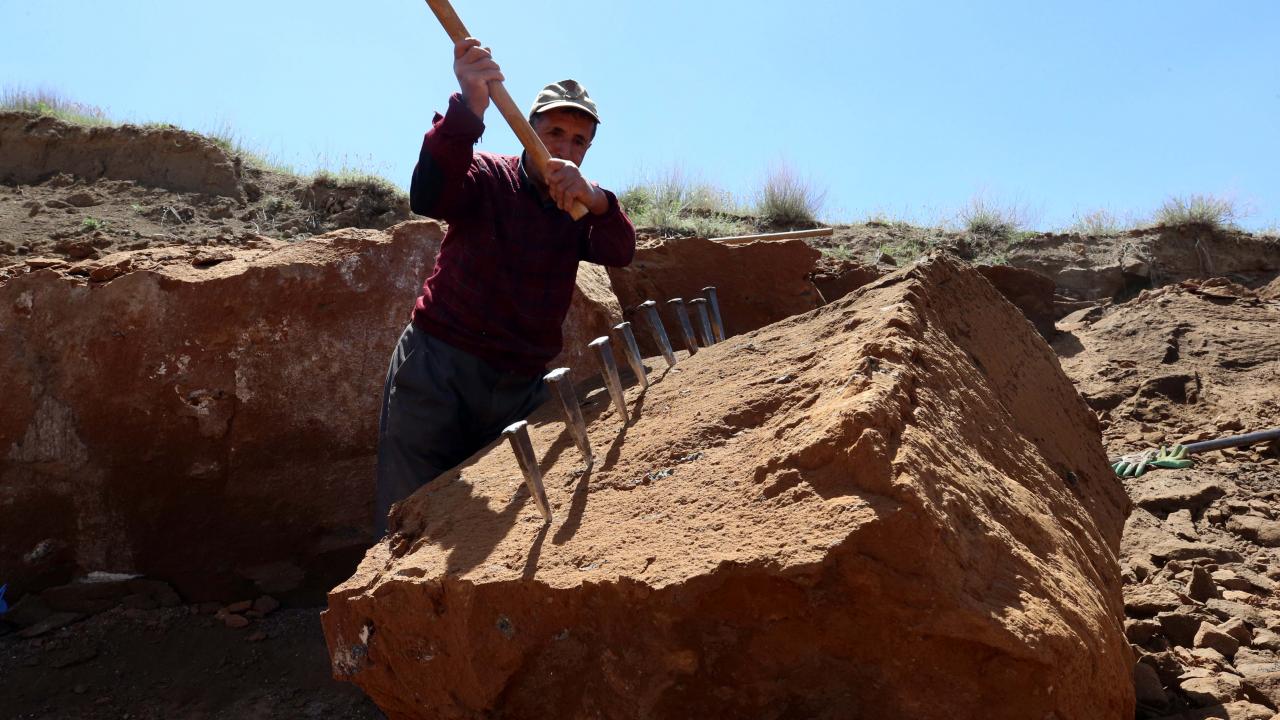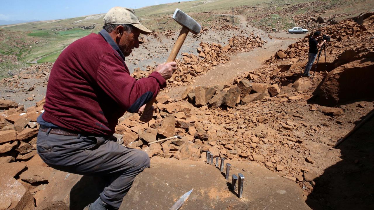 Bitlis'in Ahlat ilçesinde taş ocağında çalışan 60 yaşındaki Recep Gürgüz, 40 yıldır elinden düşürmediği balyozuyla kaya bloklarını parçalıyor. Gürgüz, manivela, kazma, çivi ve 4 kilogramlık balyoz kullanarak geleneksel yöntemlerle taş kırıyor.