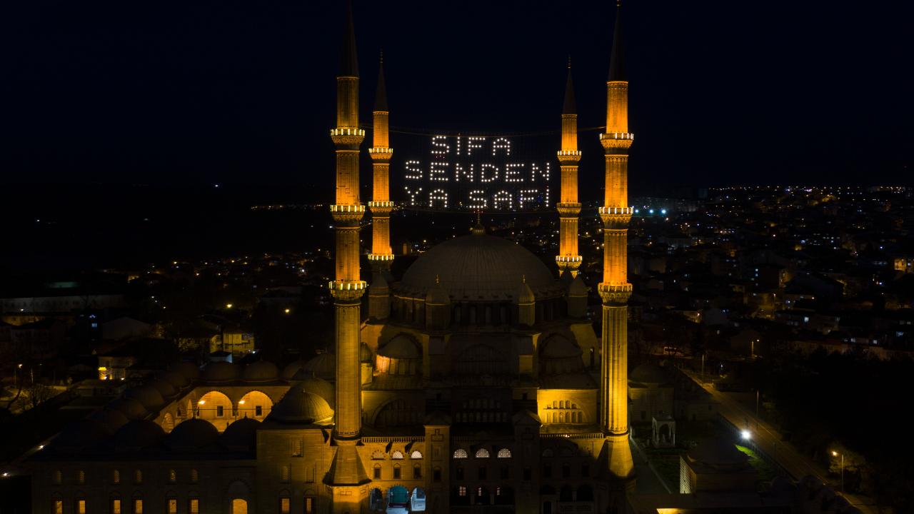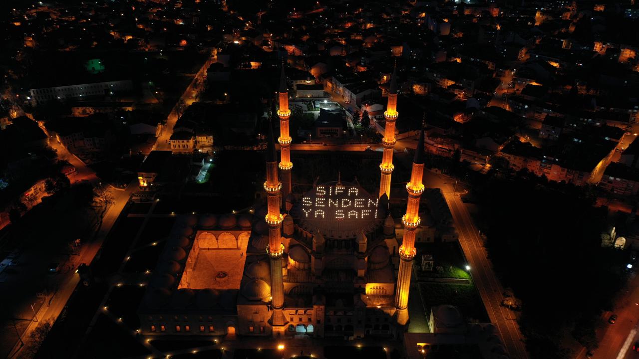 Mimar Sinan`ın ustalık eseri Selimiye Camii minarelerine takılan "Şifa senden ya Şafi" yazan mahya yakıldı.