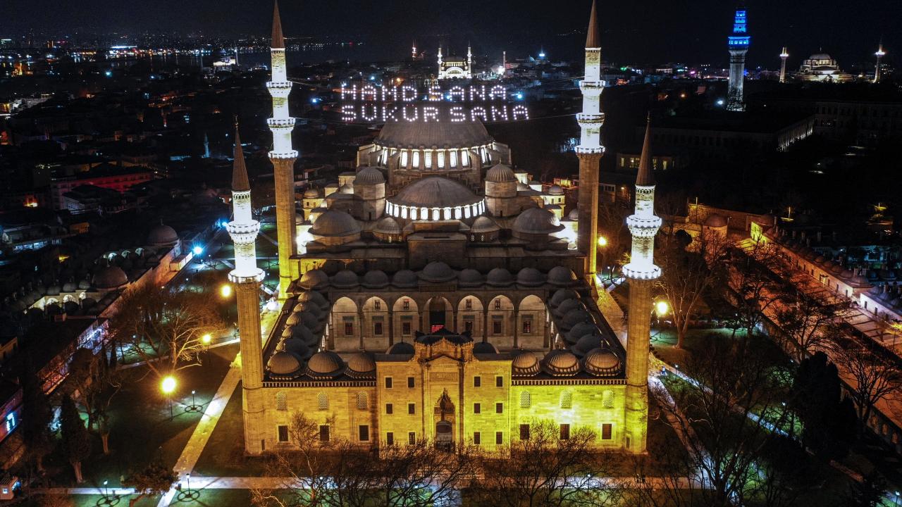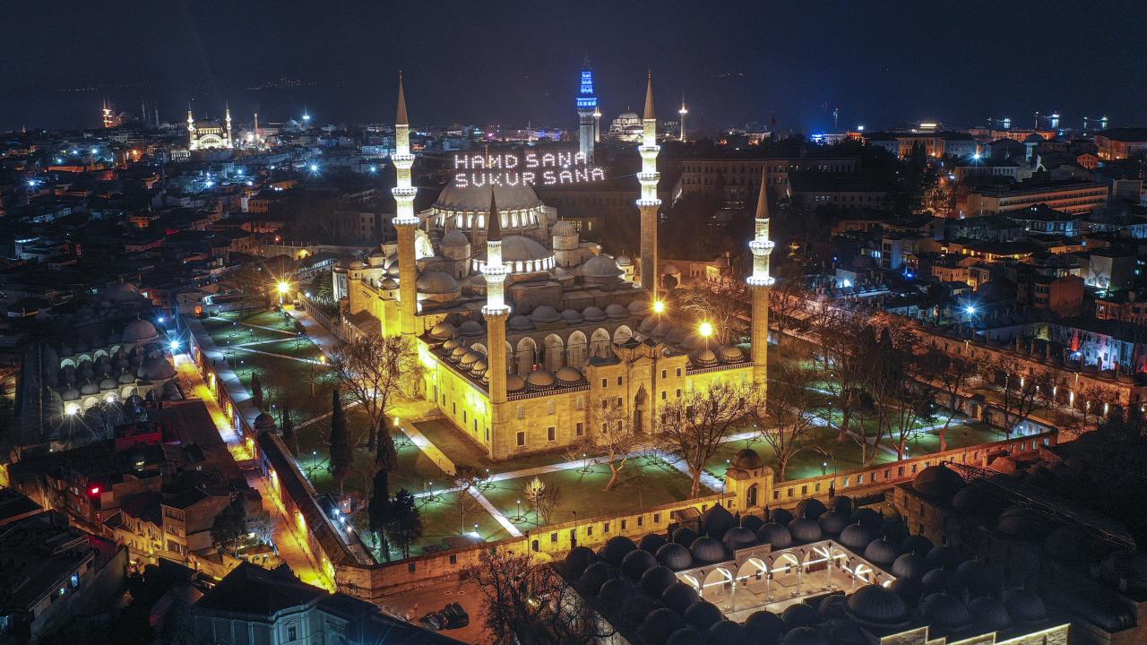 Ramazan ayının gelmesi nedeniyle Süleymaniye Camii`nin minarelerinde "Hamd Sana Şükür Sana" yazılı mahya yer aldı.