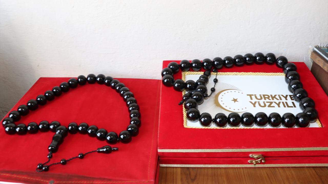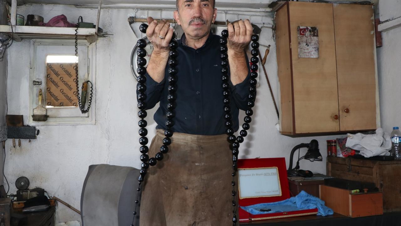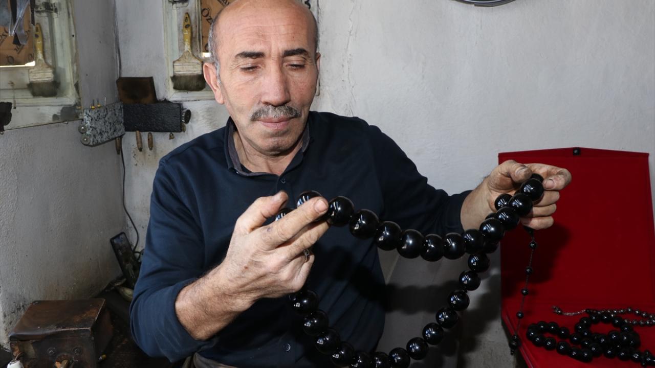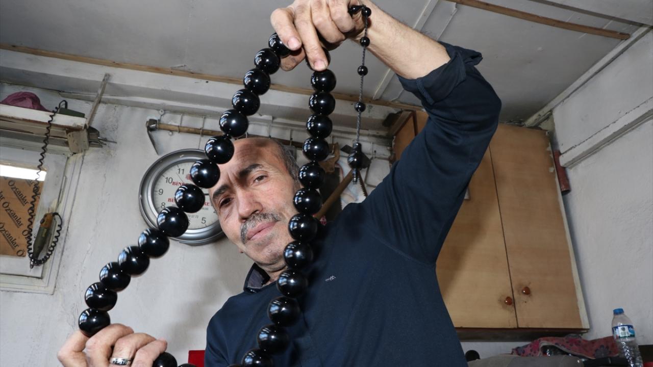 Erzurum'da tespih yaparak ailesinin geçimini sağlayan 58 yaşındaki Veysel Başar, çocuk yaşlardan beri biriktirip toprak altında sakladığı büyük Oltu taşlarından iri iki tespih yaptı.