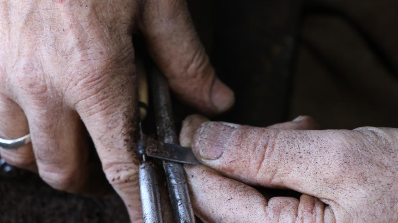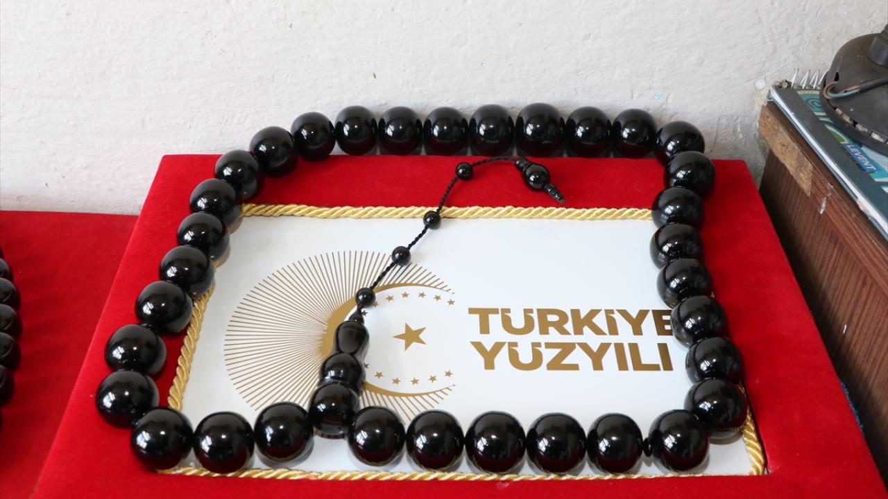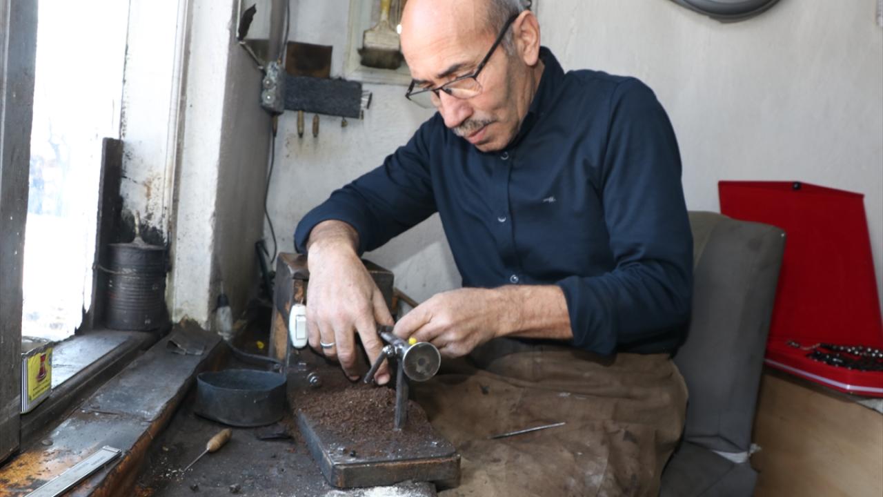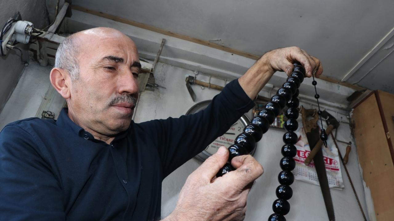 Erzurum'da tespih yaparak ailesinin geçimini sağlayan 58 yaşındaki Veysel Başar, çocuk yaşlardan beri biriktirip toprak altında sakladığı büyük Oltu taşlarından iri iki tespih yaptı.