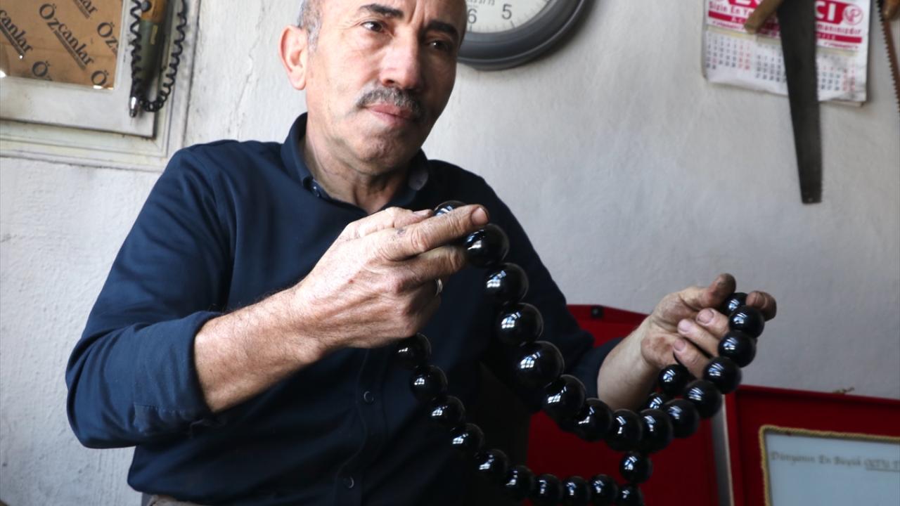 46 yıl toprak altında biriktirdiği büyük Oltu taşlarından iri tespihler yaptı