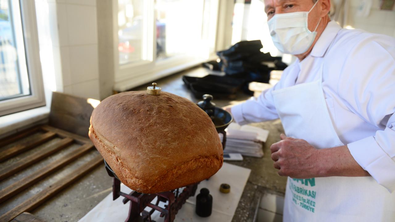 Üst kabuğundaki kalınlık ve lezzetiyle ön plana çıkan ekmek, eski tip ağırlıklı teraziyle tartılarak satılıyor.