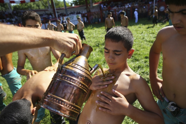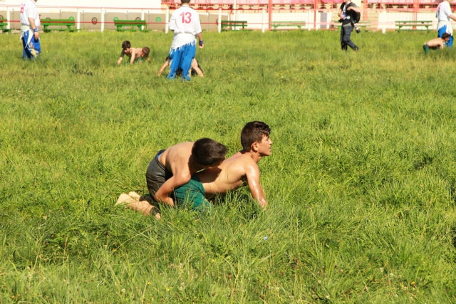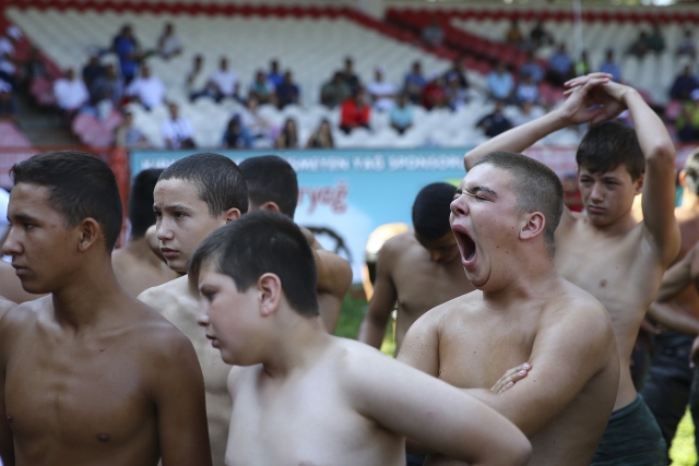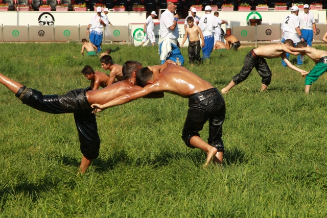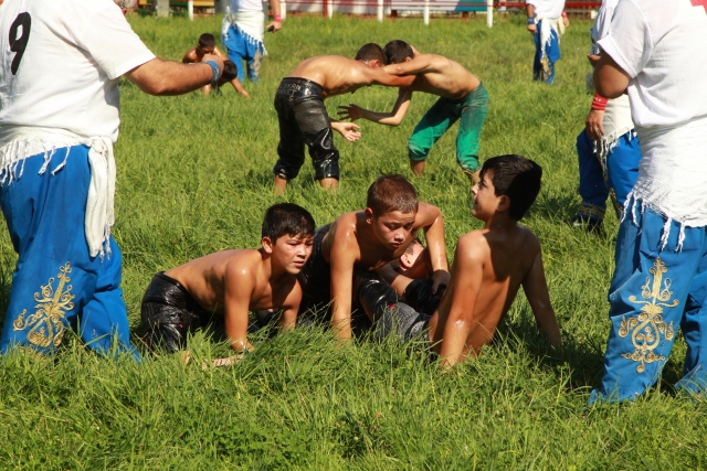 656. Tarihi Kırkpınar Yağlı Güreşleri minik boy pehlivanların güreşe tutuşmasıyla başladı. Tarihi Sarayiçi Er Meydanı'nda kule hakemlerinin çağrısıyla sahaya gelen minik 1 boy pehlivanları rakipleriyle kol bağlamaları sonrası peşreve çıktı.